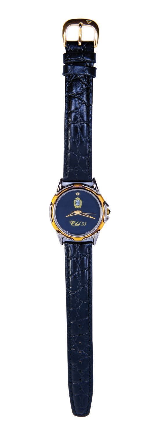(Disneyland, 2000s) A stylish men's watch from Disneyland's exclusive Club 33. The limited edition watch features the Club 33 name and logo on the face with genuine leather band. Measuring 9.25" long, the watch case and band are in good condition with minor wear.