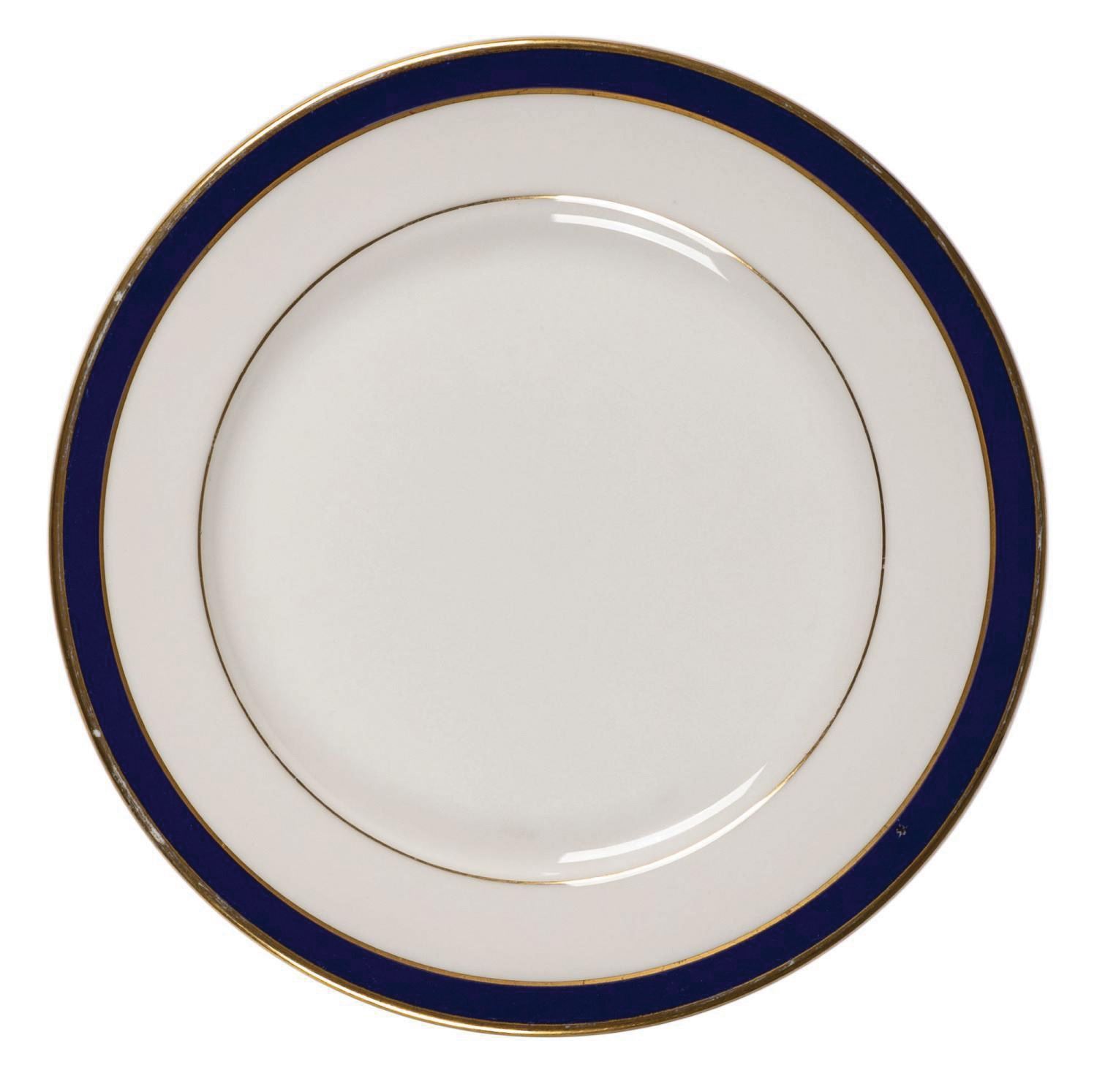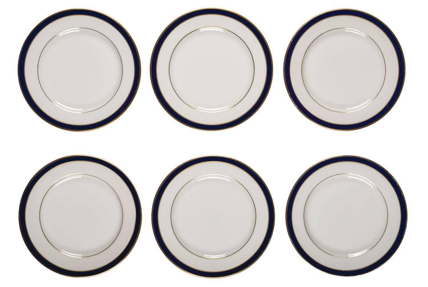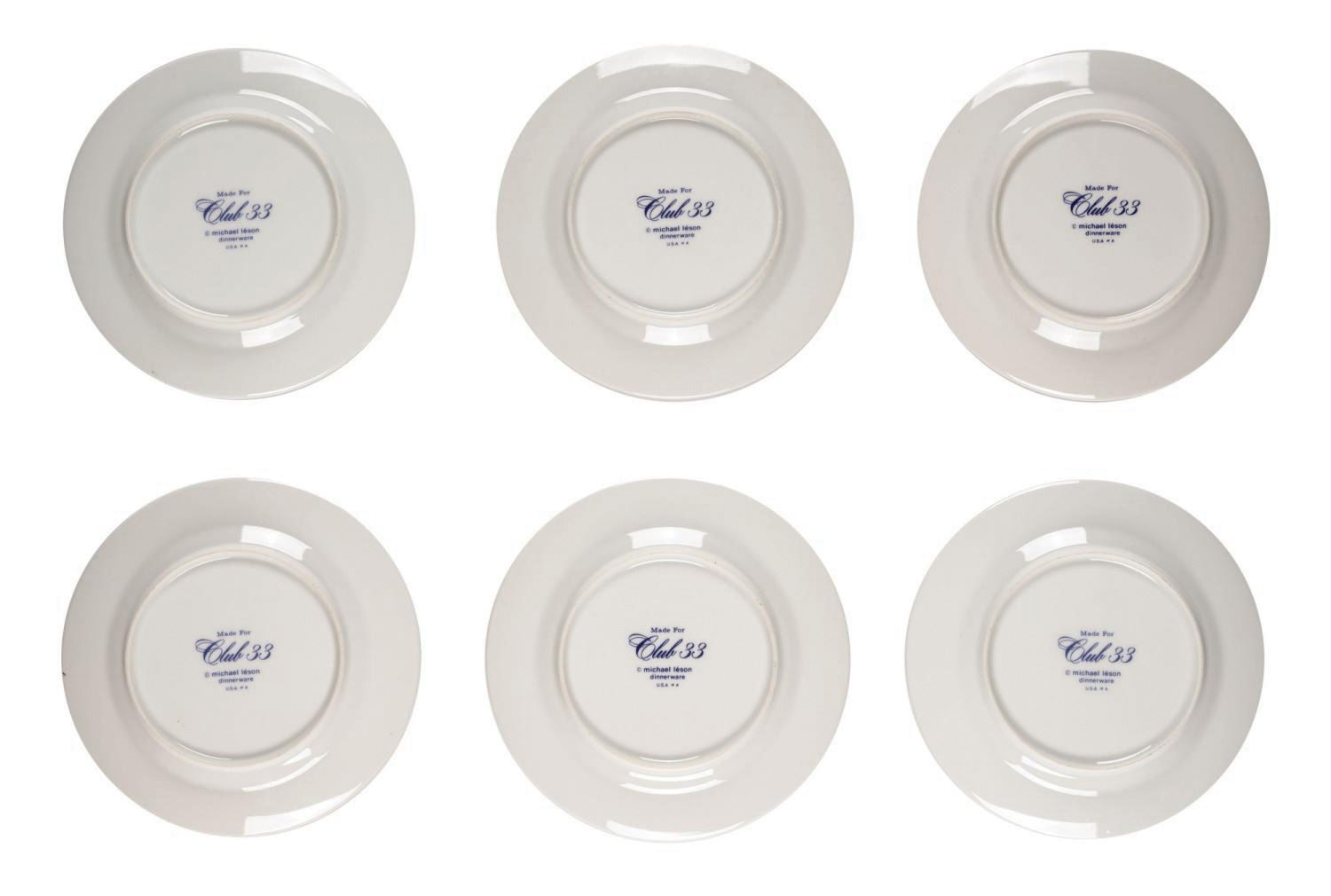 (Disneyland, 1990s-2004) A collection of (6) ceramic bread plates specially created by Homer Laughlin and Michael Léson for Disneyland's exclusive Club 33. Measuring 6.5" in diameter, the ceramic plates "made for Club 33" are accented by the Club's bold color palette of blue and gold, and feature the Michael Léson Dinnerware backstamp, while retaining few scuffs and minor wear from use by Members and Guests.