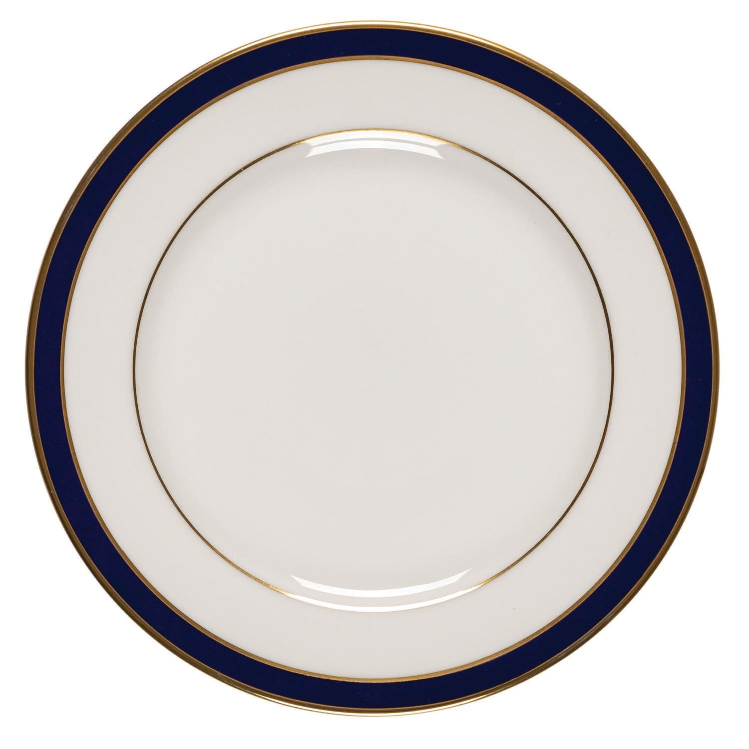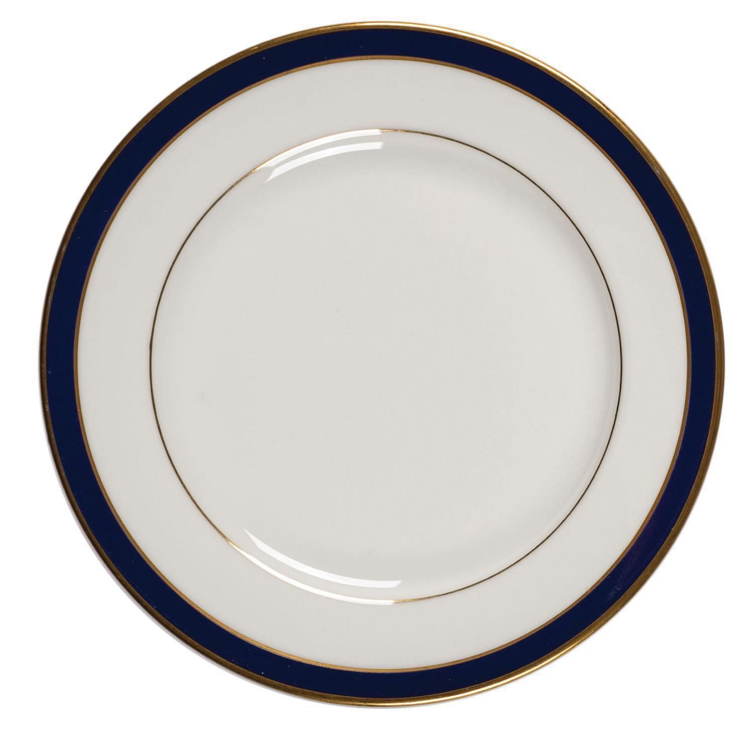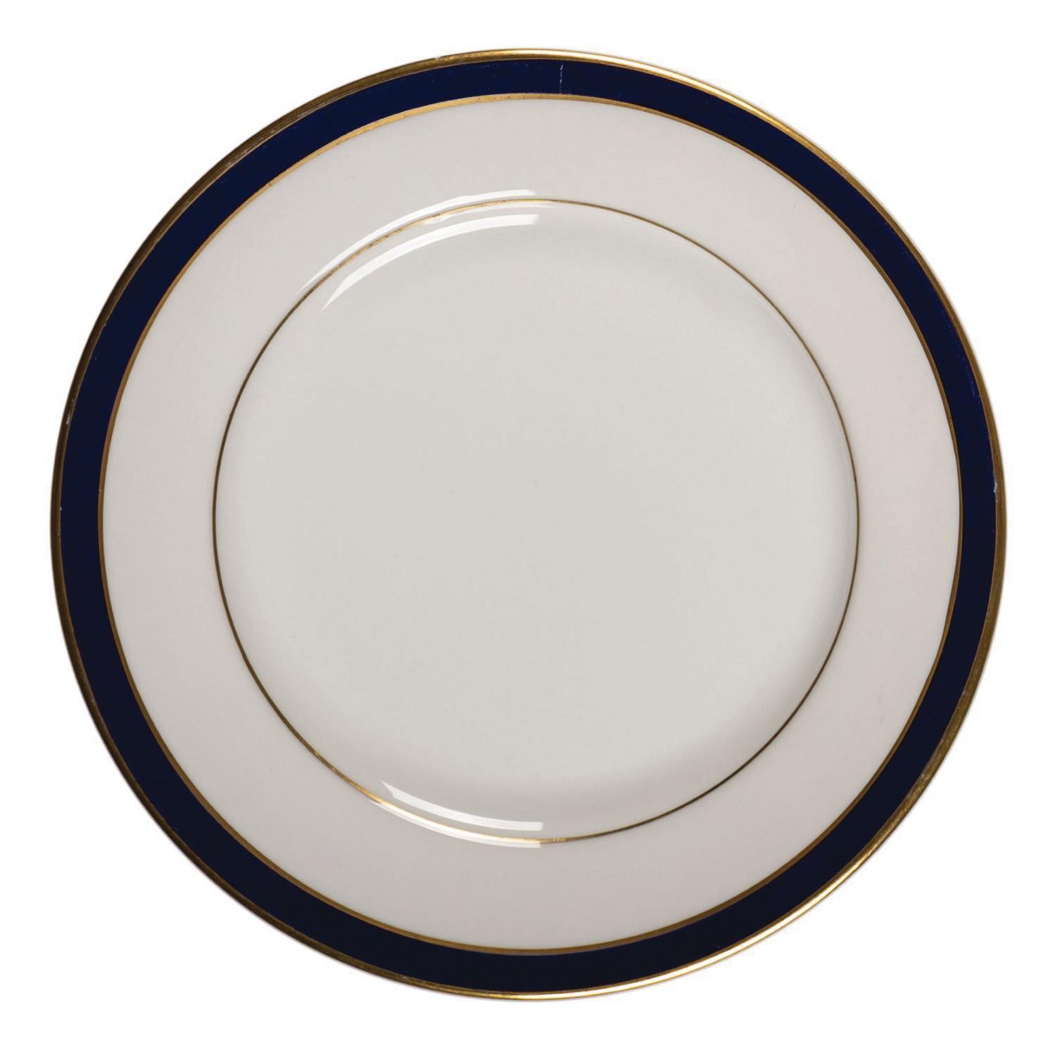 (Disneyland, 1990s-2004) A collection of (6) ceramic bread plates specially created by Homer Laughlin and Michael Léson for Disneyland's exclusive Club 33. Measuring 6.5" in diameter, the ceramic plates "made for Club 33" are accented by the Club's bold color palette of blue and gold, and feature the Michael Léson Dinnerware backstamp, while retaining few scuffs and minor wear from use by Members and Guests.