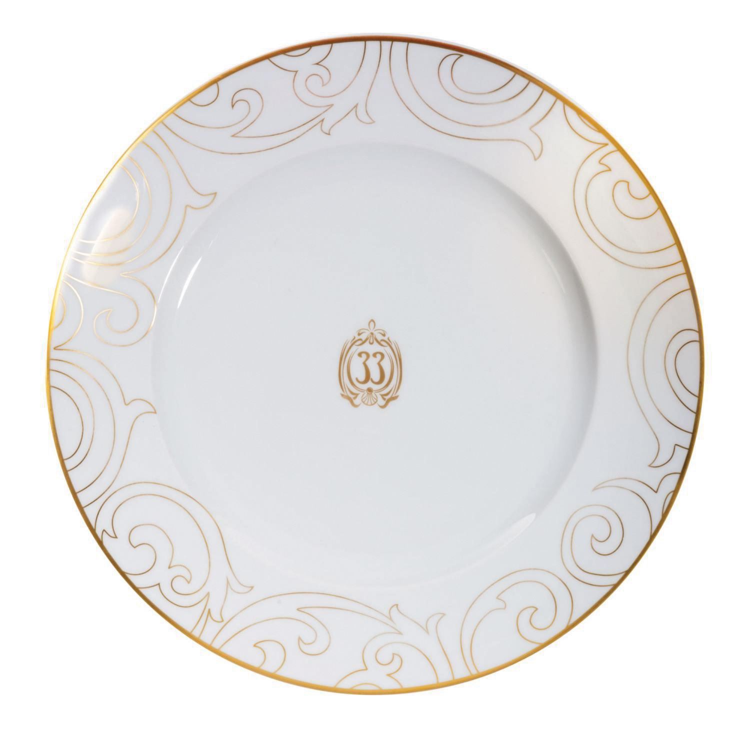 (Disney, c.2000s) A service plate, manufactured by Rosenthal for Club 33 at Disneyland. The charger reflects the New Orleans Square establishment's chic design, offering delicate gold linework encompassing the Club's nouveau style logo upon an eggshell white porcelain, with Rosenthal's backstamp. Measuring 11.5" in diameter, the service plate is in good condition exhibiting only minor surface wear from use.