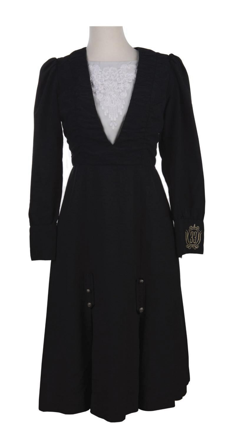 (Disneyland, 2000s) A fanciful server dress and dickey manufactured for staff of Club 33 at Disneyland. The French style ensemble is embellished with a floral embroidered dickey and Club 33 logo on the sleeve. Measuring a size 10, the wardrobe displays in very good condition, missing few buttons, retaining original Disneyland labels.