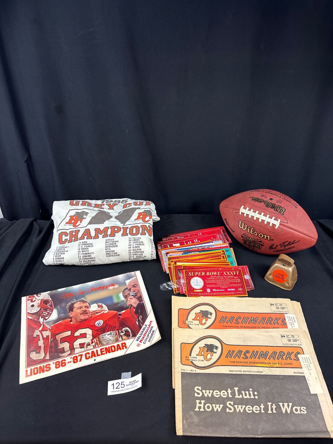 Collectible Football Lot, BC Lions, 85 Grey Cup Sweater + Ball Budweiser Tickets, Etc