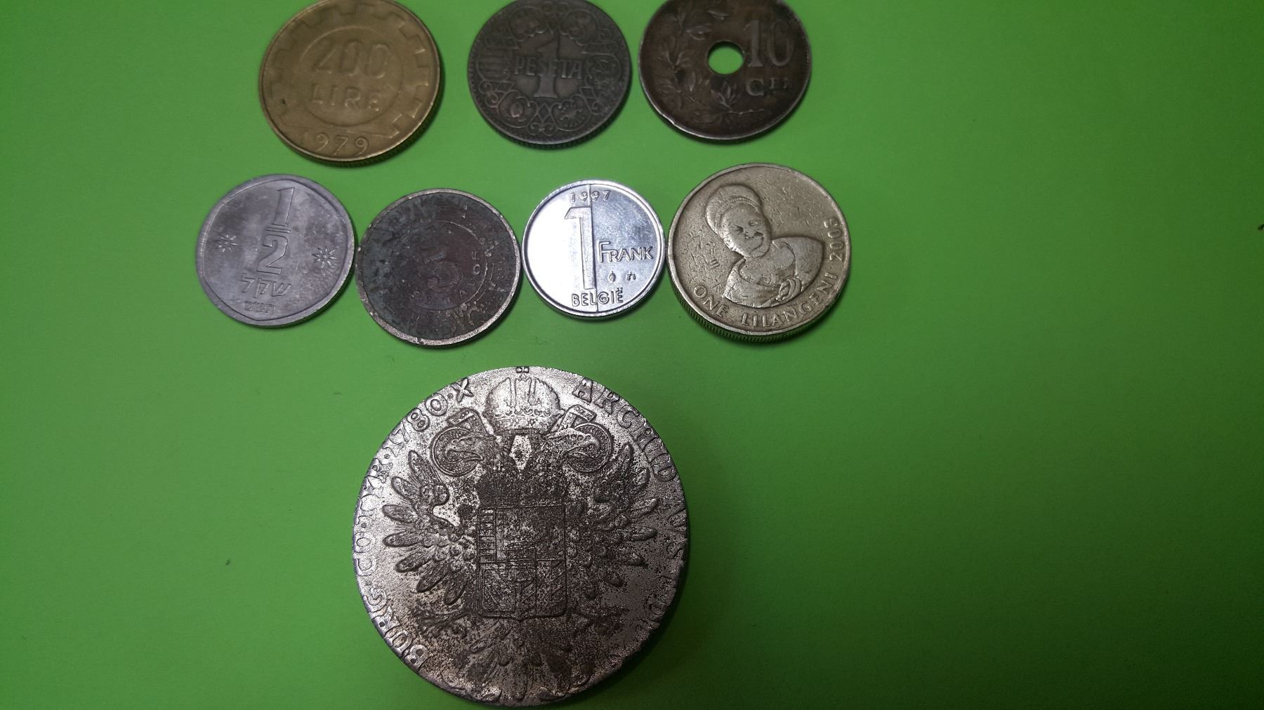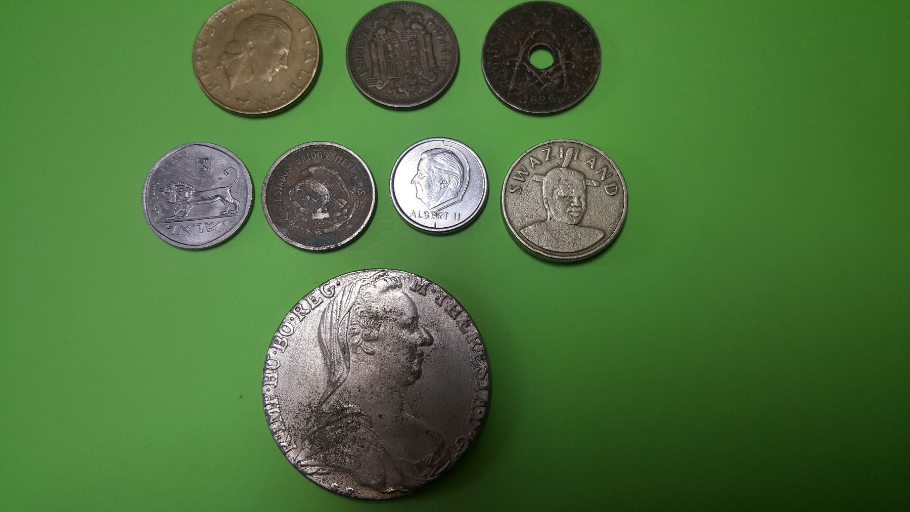 Collection of 8 world coins from various countries including Spain, italy and Swaziland. Condition of coins vary from good to extremely fine.