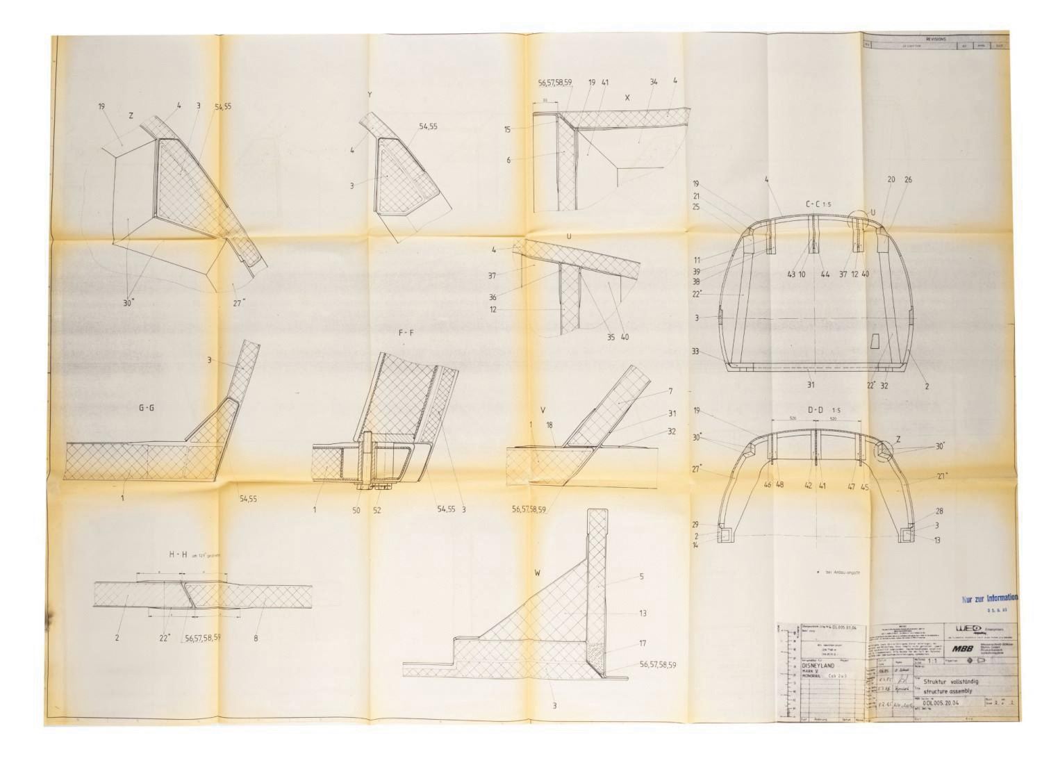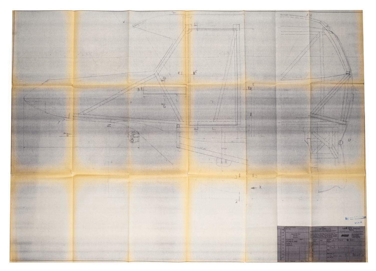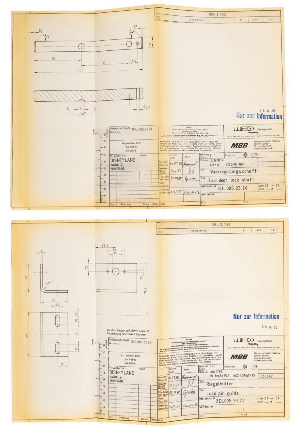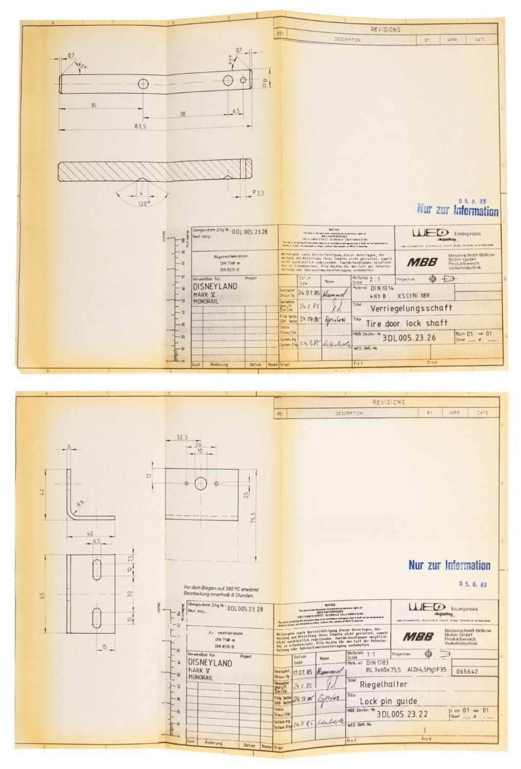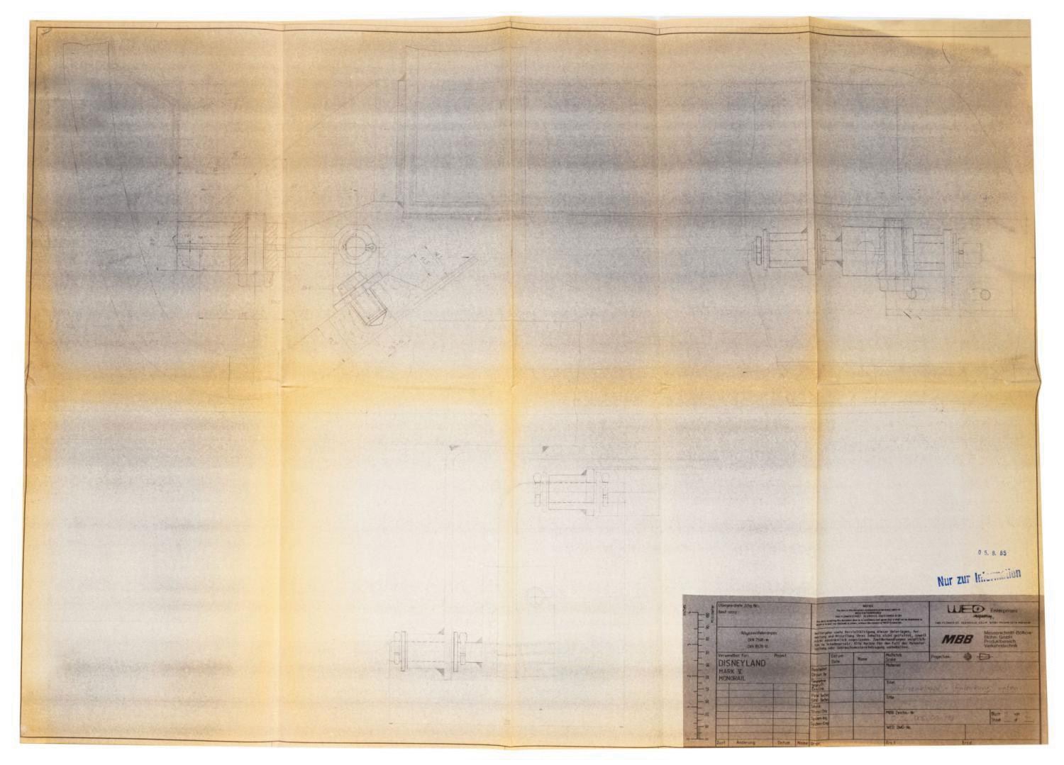 (Disneyland, 1985) A collection of (17) printed schematic renderings used in the production of the Monorail Mark V trains for Disneyland. The new trains were designed by George McGinnis of WED Imagineering Enterprises, and the parts were researched, engineered, and manufactured by outside contractor Messerschmitt-Bolkow-Blohm. The renderings contain a wealth of information, including details on panels, seats, floors, and more of the Monorail Mark V. Measuring various sizes between 32"x46.25" and 11"x17", the printed renderings display in very good condition, exhibiting mild toning and handling wear.