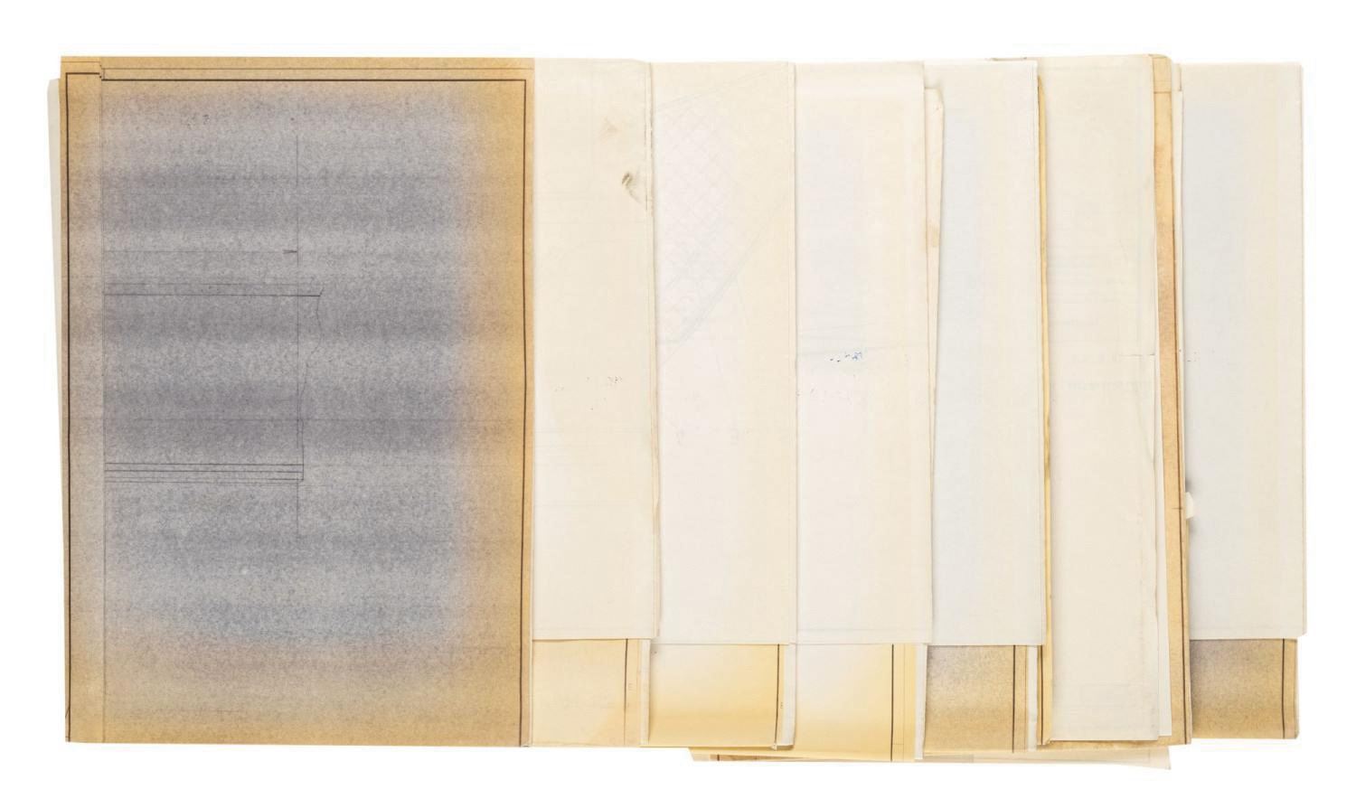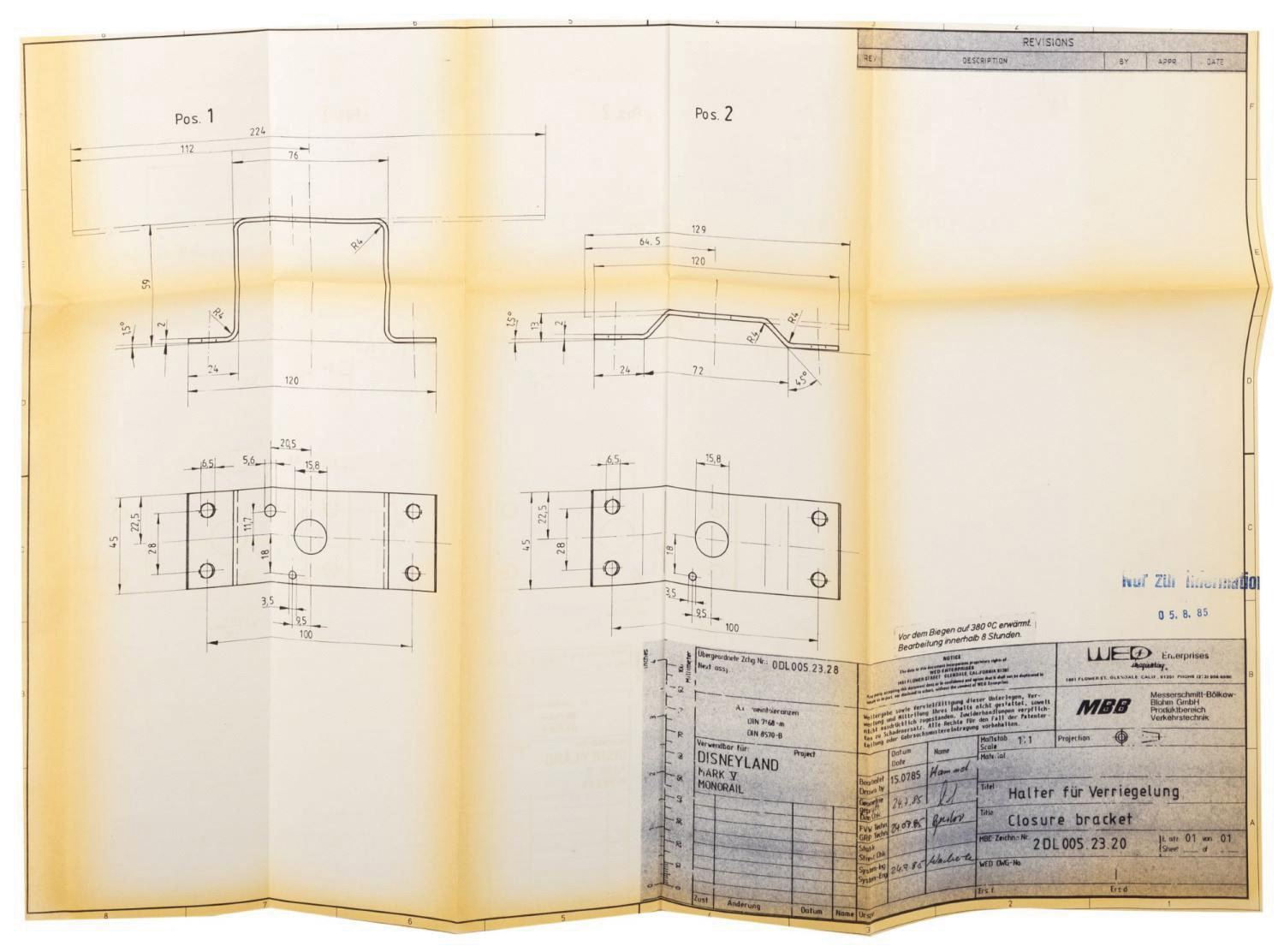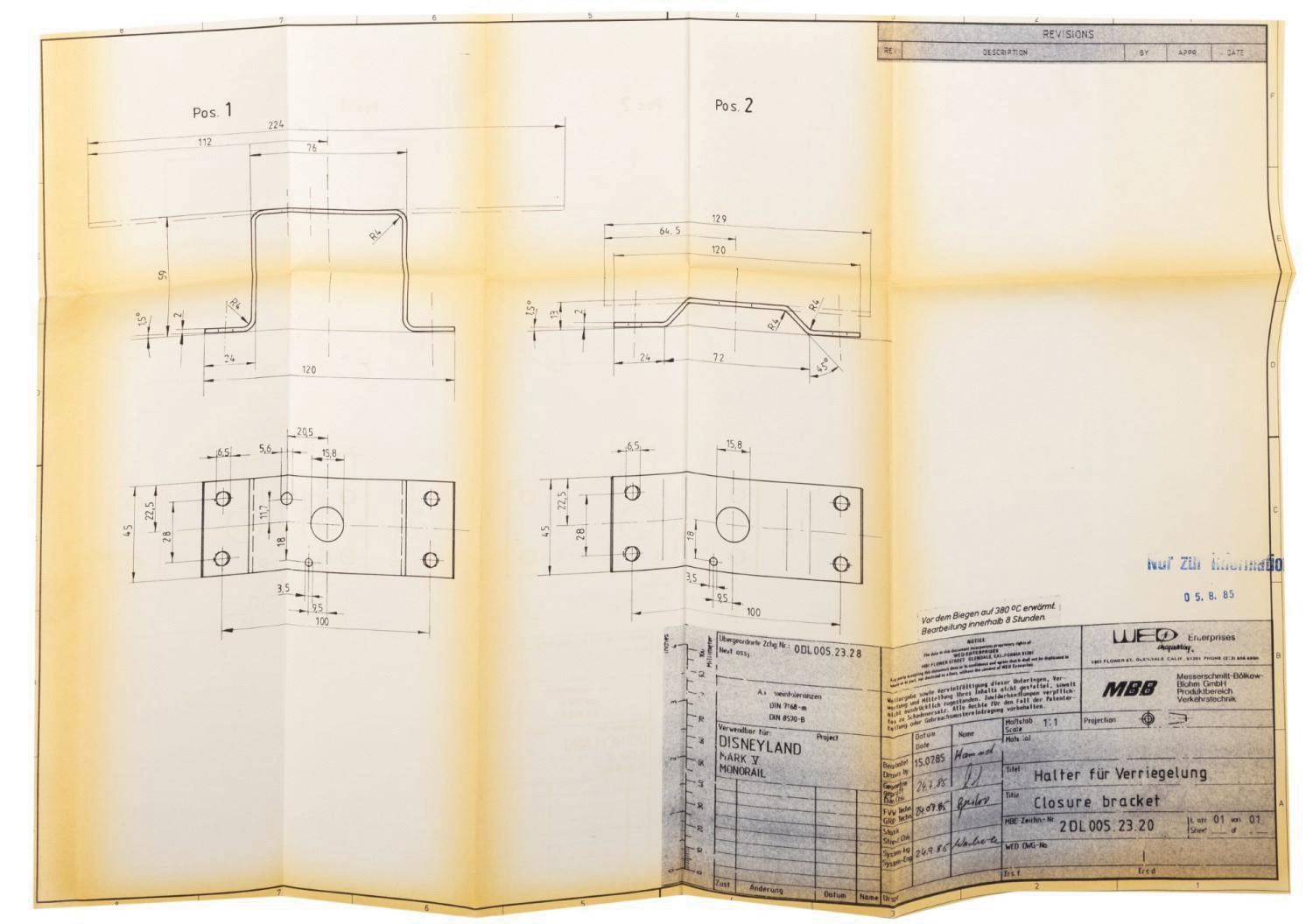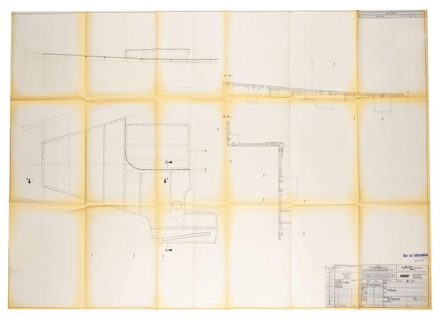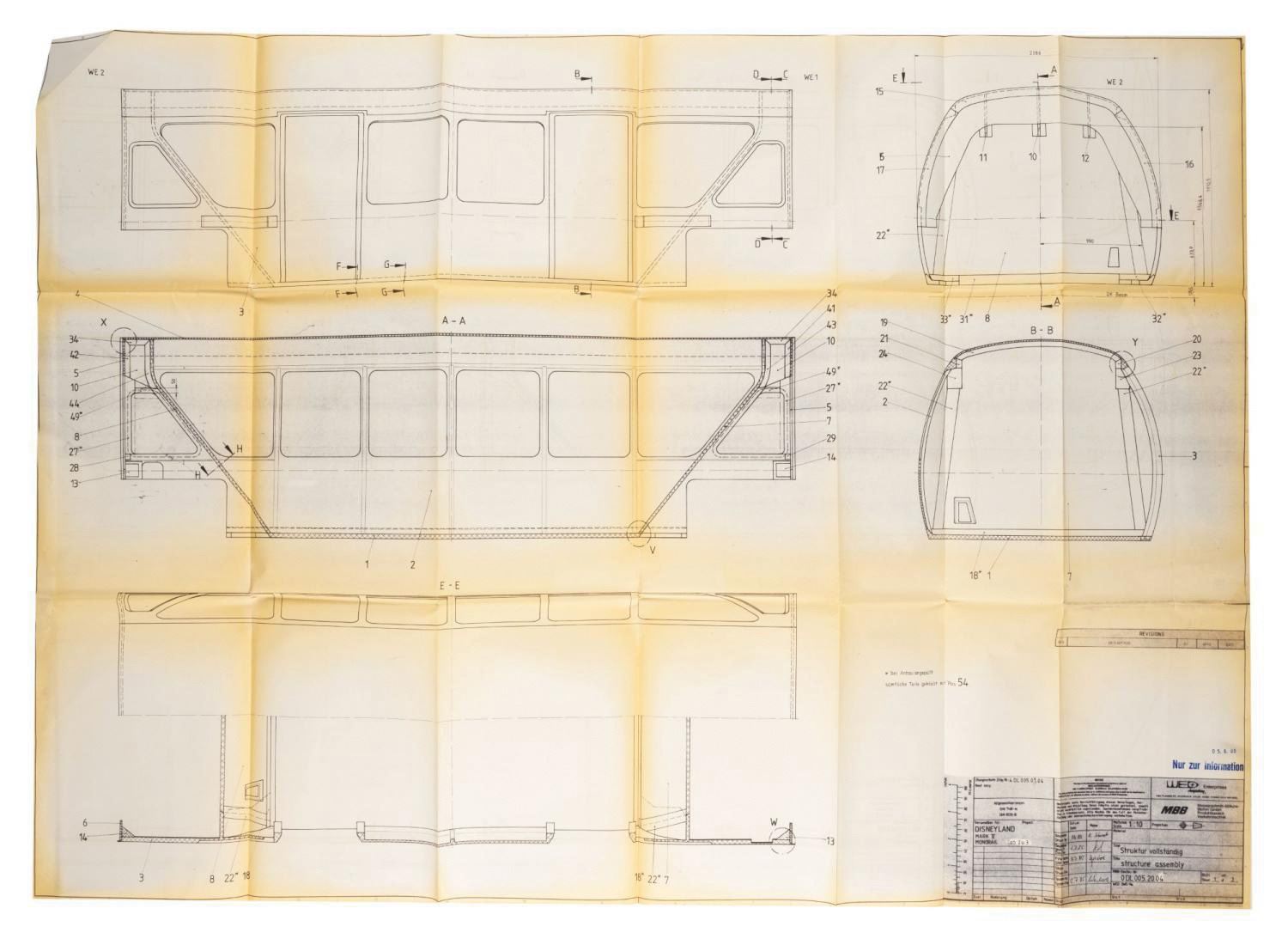 (Disneyland, 1985) A collection of (17) printed schematic renderings used in the production of the Monorail Mark V trains for Disneyland. The new trains were designed by George McGinnis of WED Imagineering Enterprises, and the parts were researched, engineered, and manufactured by outside contractor Messerschmitt-Bolkow-Blohm. The renderings contain a wealth of information, including details on panels, seats, floors, and more of the Monorail Mark V. Measuring various sizes between 32"x46.25" and 11"x17", the printed renderings display in very good condition, exhibiting mild toning and handling wear.
