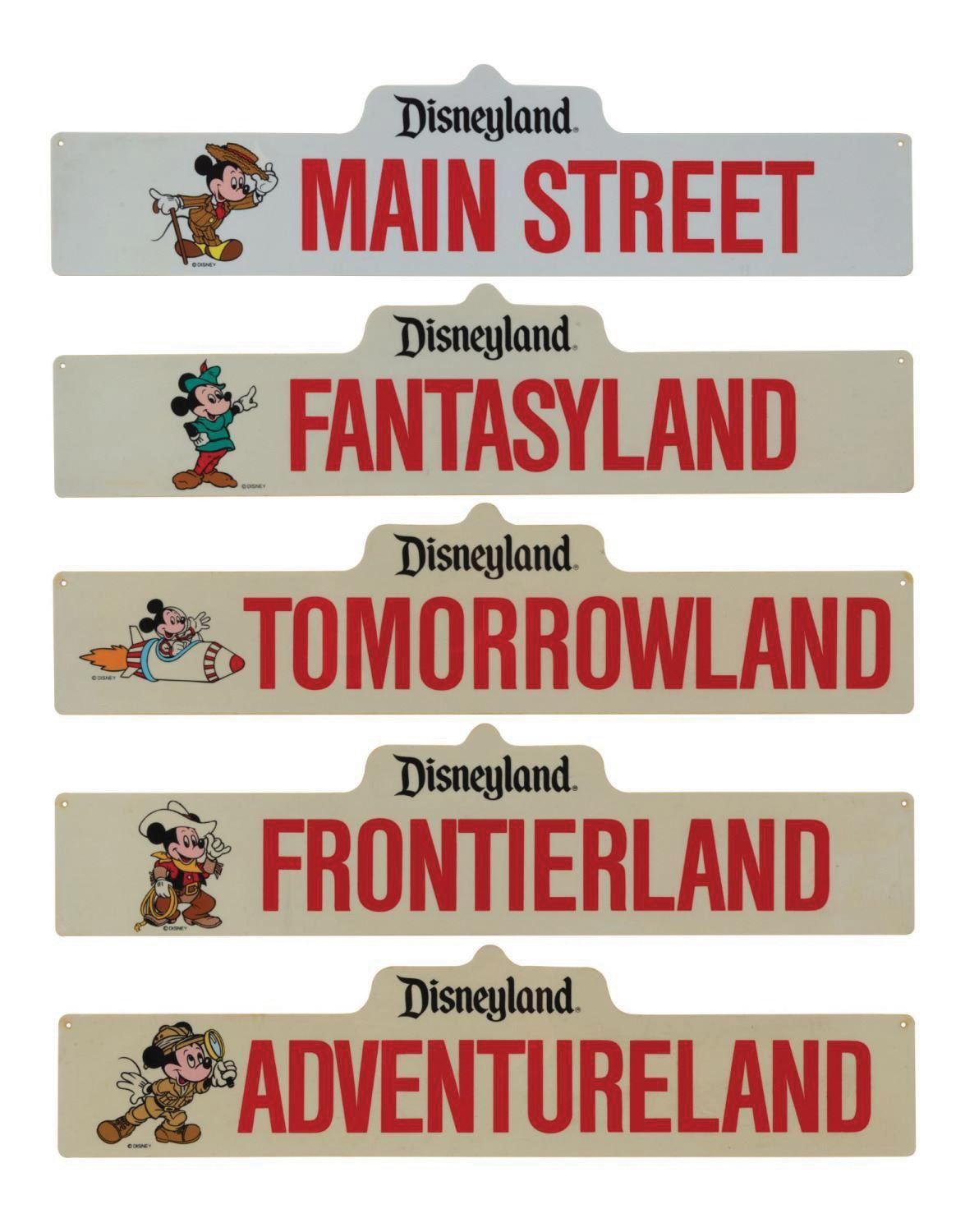 (Disneyland, c.1980s-90s) A set of (5) Disneyland souvenir street signs. Featuring Mickey Mouse introducing Main Street, Adventureland, Frontierland, Fantasyland, and Tomorrowland, the signs measure 4.5"x18" each. They are in very good condition, exhibiting minor color toning from age.