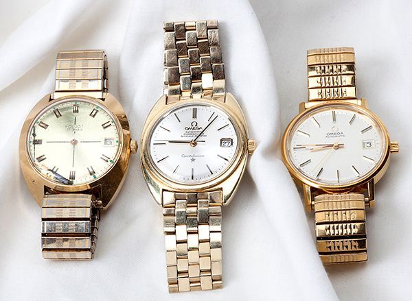 Collection of Gents Yellow Metal Wristwatches. Including one Omega Constellation wristwatch, having an automatic movement, silver dial with stick markers, sweep seconds hand and date window, with the original Omega link band; one Omega automatic movement, yellow metal case, silver dial with gold stick markers, sweep seconds hand and date window, with a flex yellow metal band and one Poljot yellow metal wristwatch with flex style band. Note: The Poljot watch is not in working order.