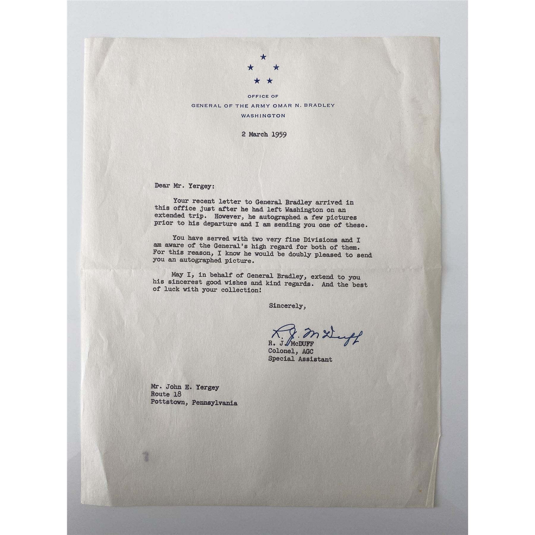 2nd March 1959 Colonel, AGC Special Assistant R.J. McDuff signed letter from the office of General Omar Nelson Bradley. 8x11 inches