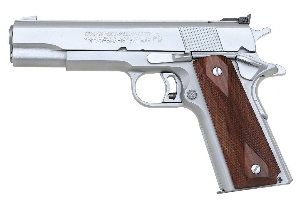 serial #70N74590, 45 ACP, 5" barrel with an excellent bore. This series 70 started life in 1979 as blue Gold Cup and was later refinished with some form of industrial hard chrome. The metal surfaces retain about 99% hard chrome finish with few minor handling marks. The grips are nice executed replacement double diamond checkered walnut by an unknown maker that rate excellent. The pistol features a hard chromed Patridge front sight, Elliason black blade fully adjustable rear sight, skeletonized trigger with overtravel stop and serrated flat mainspring housing. The pistol includes a single Colt-marked stainless steel magazine with blue Shooting Star replacement follower. The pistol also includes a spare Gold Cup sear, sear depressor and sear depressor spring. This gun should be about as weather proof as you can get a firearm, save for a few parts. (8A11739-143) {MODERN} (1200/1800)