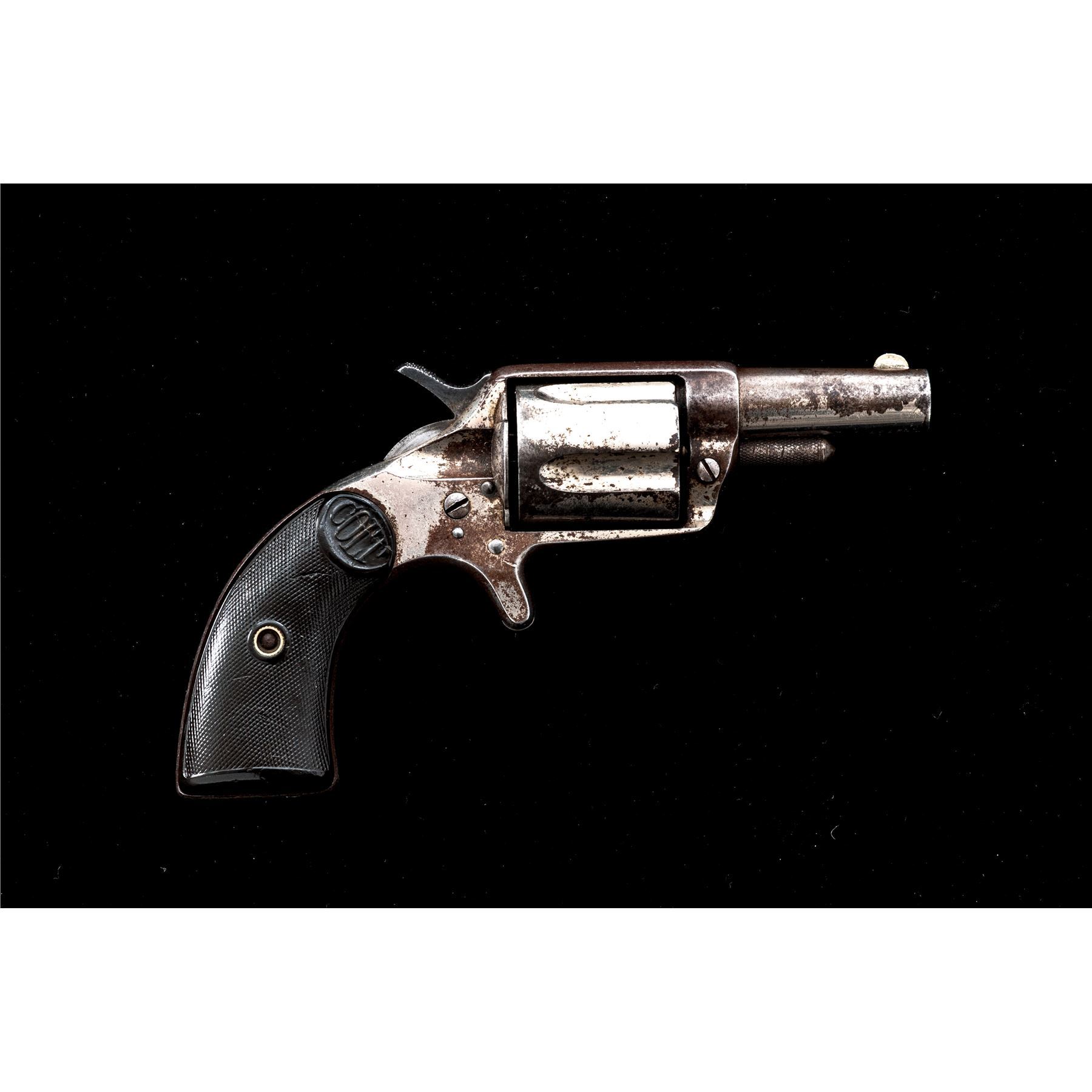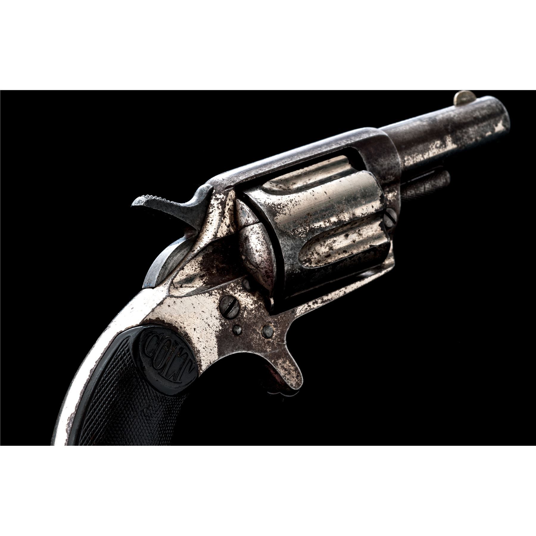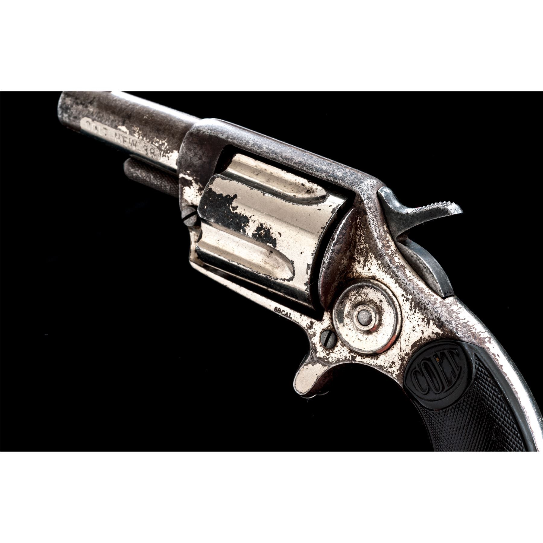Antique Colt ''New House'' Spurtrigger Pocket Revolver, #12737, .38 CF cal., 2.25'' barrel is marked with the Colt name and address on top, the serial number at muzzle bottom, and ''Colt New 38'' in an etched panel on left side; long-fluted round 5-shot cylinder; solid frame with integral trigger sheath and grip straps; finely checkered two-piece black hard rubber grips having ''Colt'' within an oval panel at top. Mfg'd ca. 1880-86 in a quantity of approx. 4,000 guns. Condition is very good, retaining approx. 50% original nickel plating having scattered erosion and puckering, but sharp edges and clear markings including barrel etching. Grips retain sharp checkering and lettering. Action is crisp; bore is clean with sharp rifling. Est.: $300-$500. (Antique)