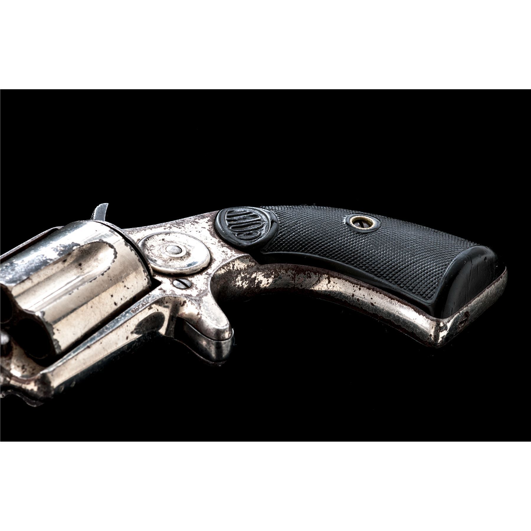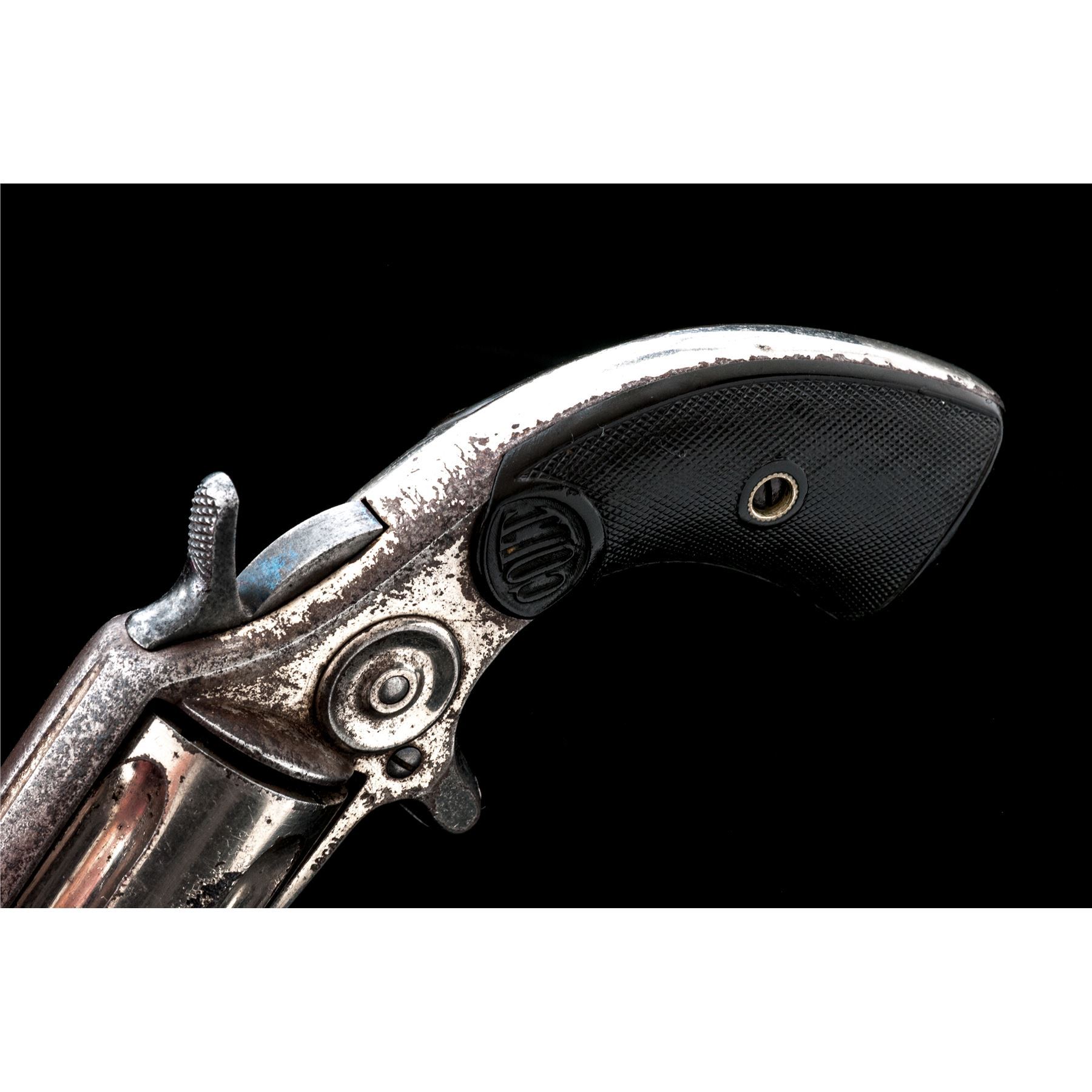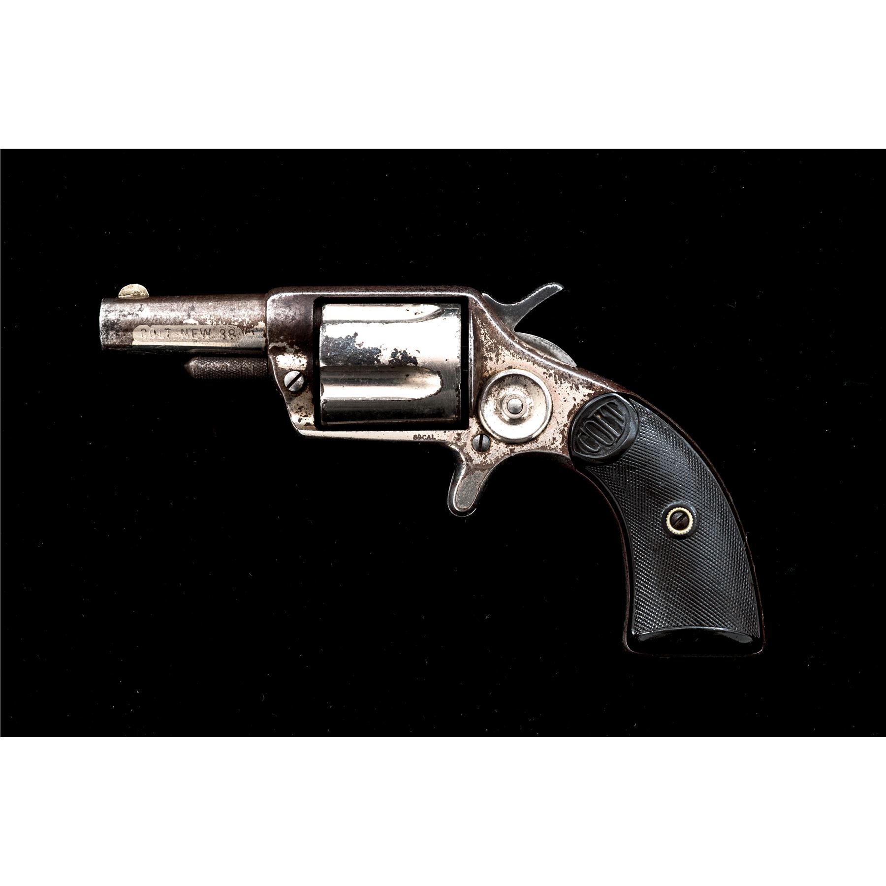 Antique Colt ''New House'' Spurtrigger Pocket Revolver, #12737, .38 CF cal., 2.25'' barrel is marked with the Colt name and address on top, the serial number at muzzle bottom, and ''Colt New 38'' in an etched panel on left side; long-fluted round 5-shot cylinder; solid frame with integral trigger sheath and grip straps; finely checkered two-piece black hard rubber grips having ''Colt'' within an oval panel at top. Mfg'd ca. 1880-86 in a quantity of approx. 4,000 guns. Condition is very good, retaining approx. 50% original nickel plating having scattered erosion and puckering, but sharp edges and clear markings including barrel etching. Grips retain sharp checkering and lettering. Action is crisp; bore is clean with sharp rifling. Est.: $300-$500. (Antique)