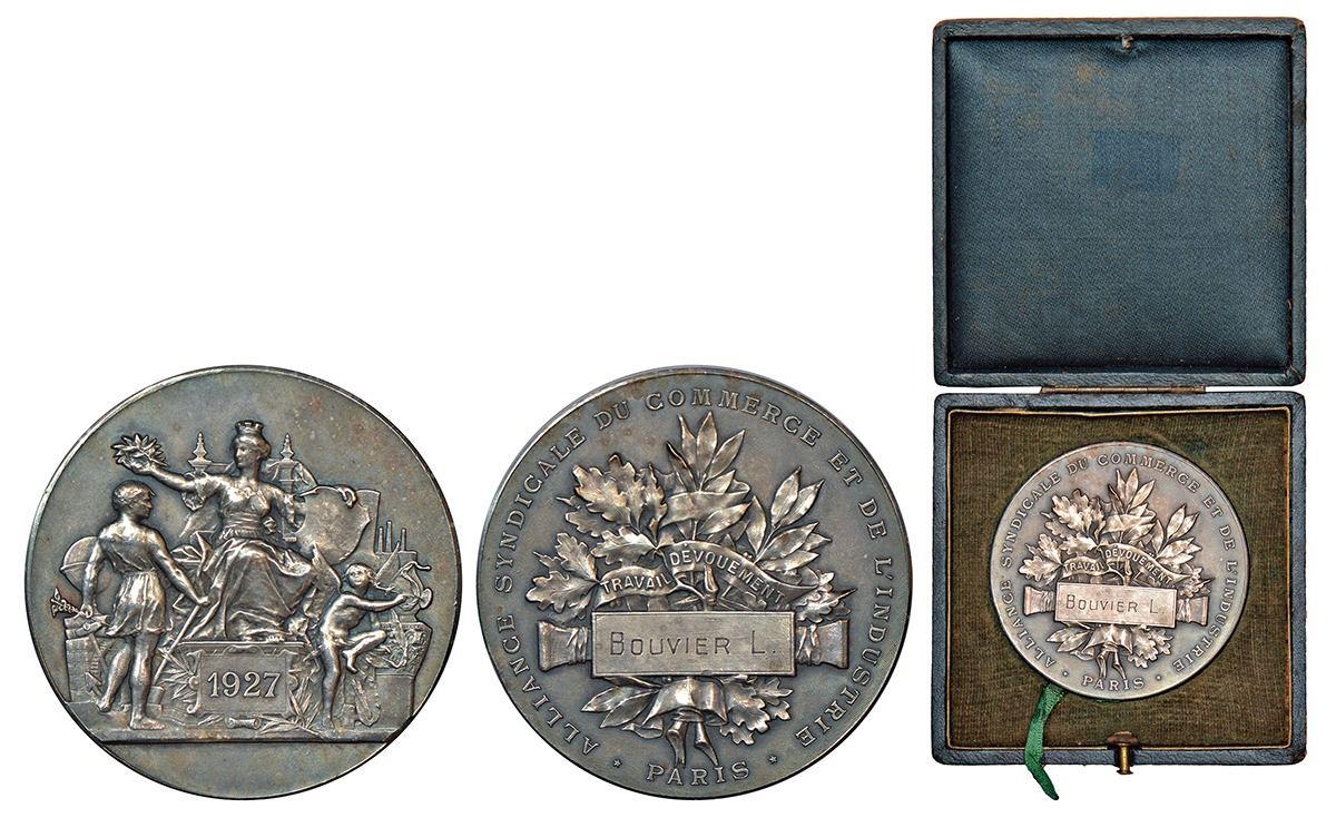 Commemorative medals, French silver medal awarded by the Alliance Syndicale du Commerce et de L'Industrie, Paris in 1927 to L. Bouvier, with allegorical representations of city goddess of Paris conferring wreath on Hermes the god of Commerce, 69.29g, with original box.