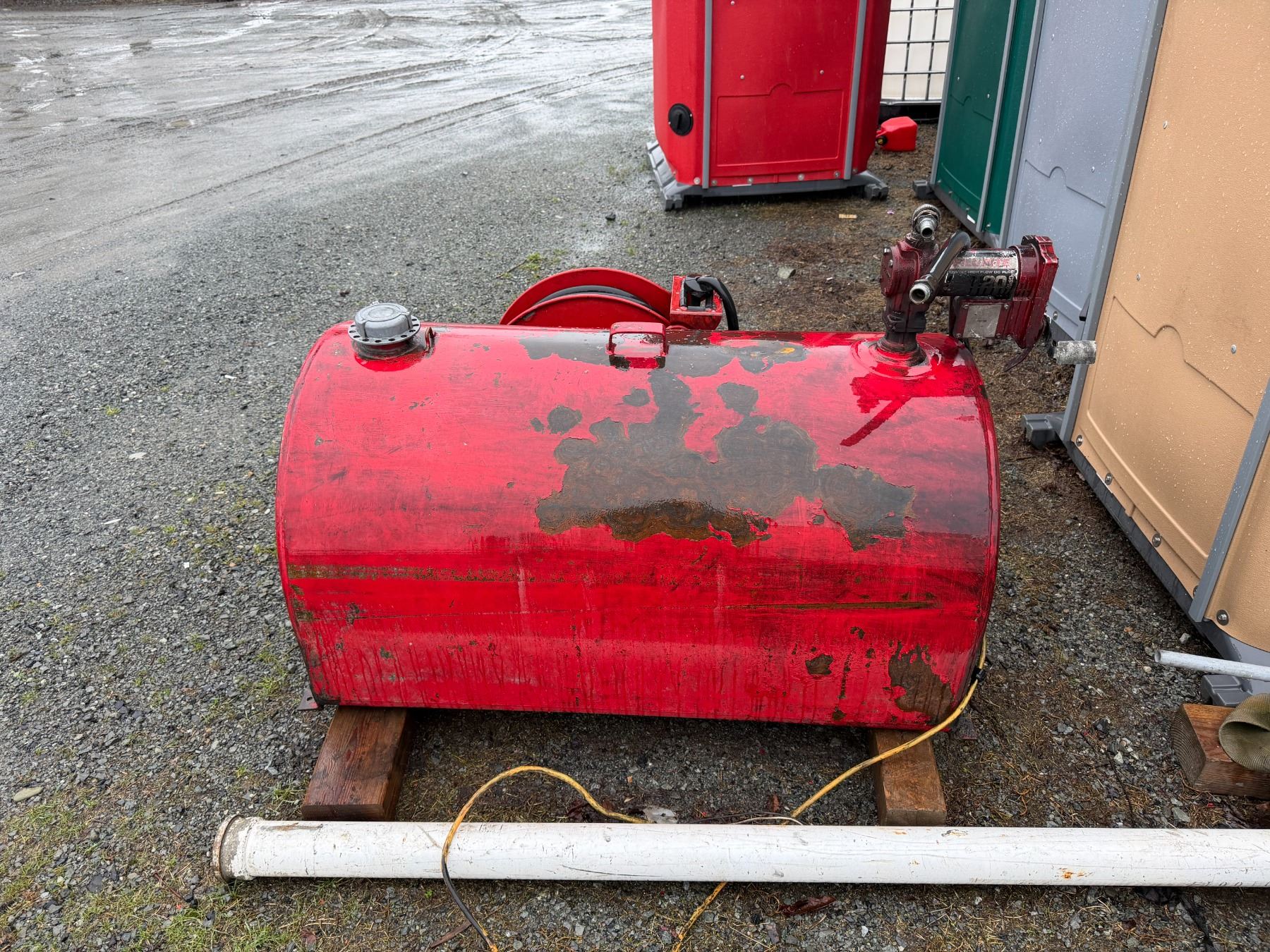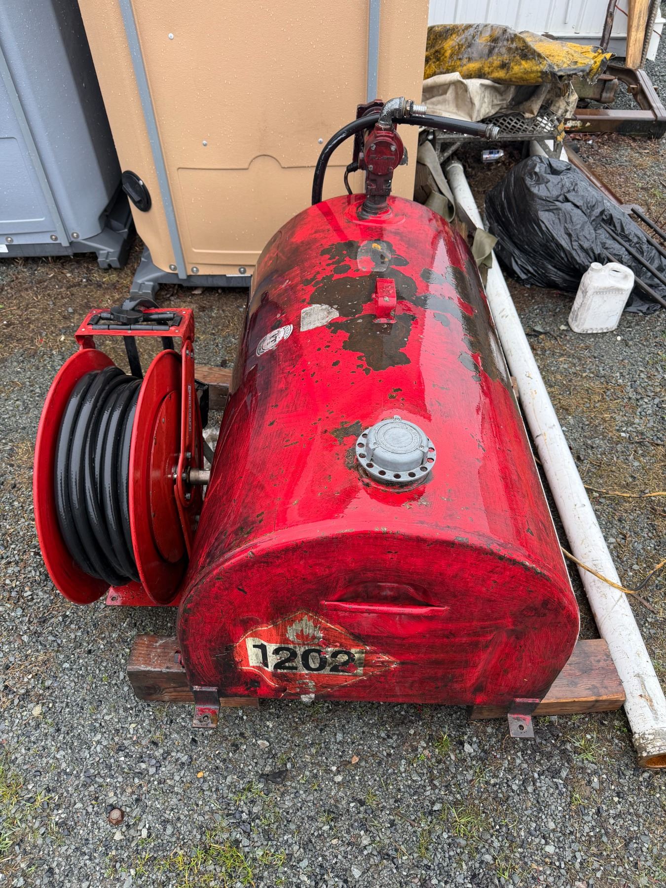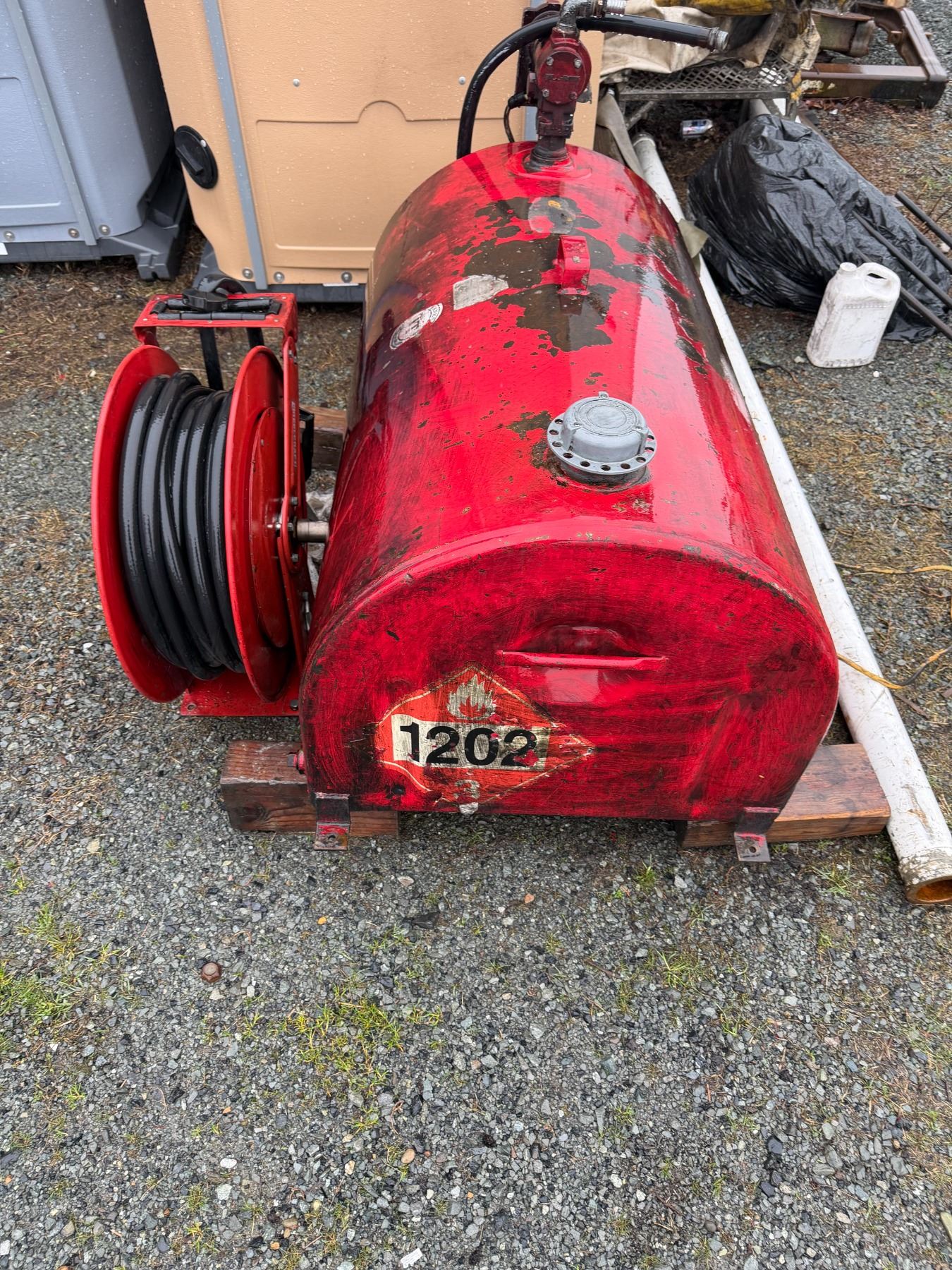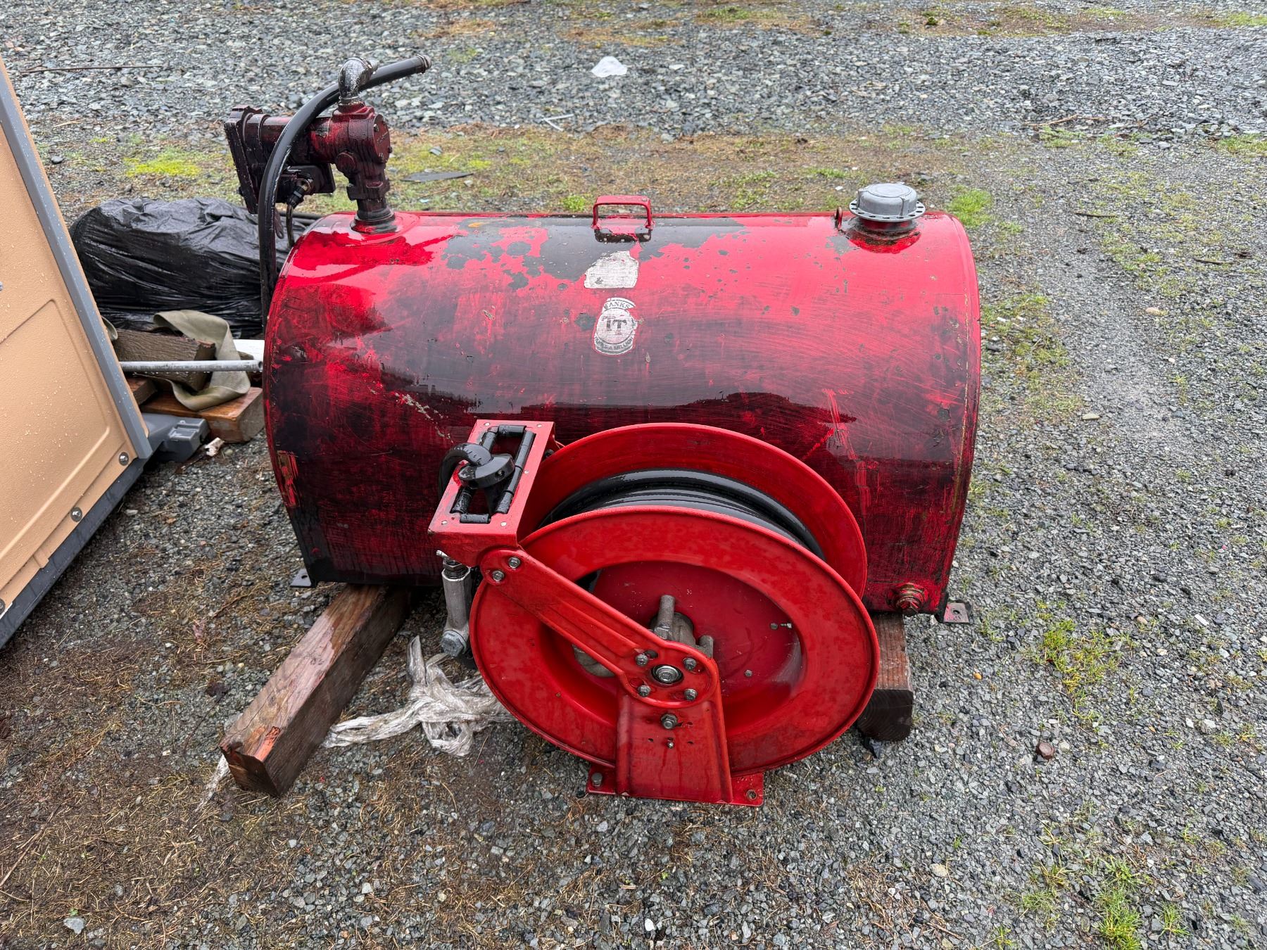 Heavy-duty steel fuel transfer tank featuring an integrated electric pump and hose reel assembly, designed for efficient on-site fuel storage and dispensing.