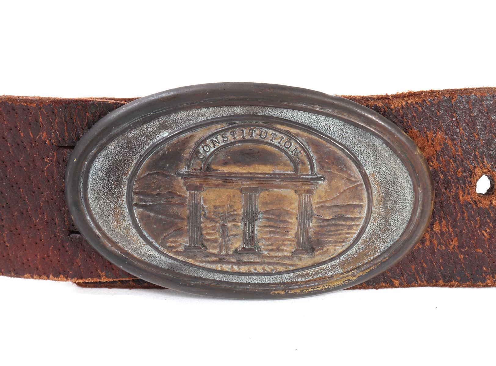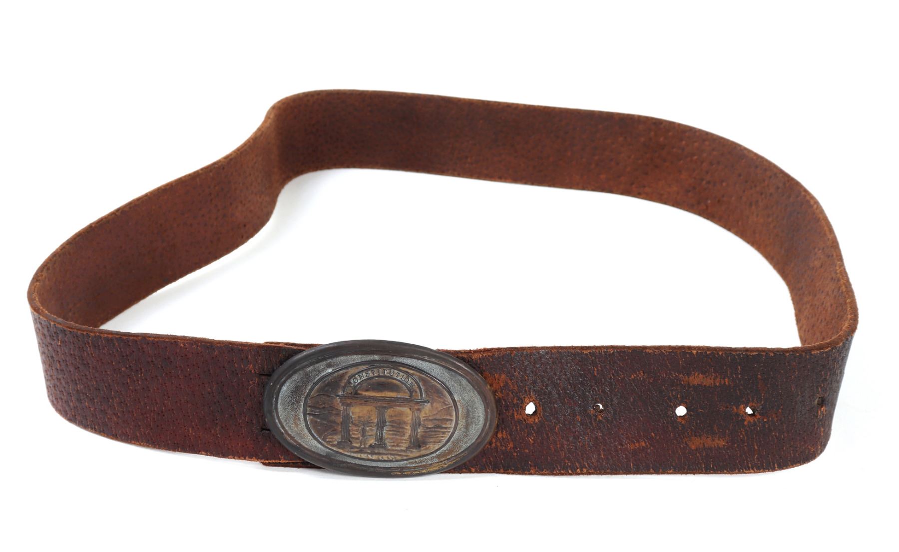Confederate Georgia State belt buckle and belt. The buckle, featuring the embossed Confederate emblem of the Georgia State arch reading Constitution with a solider standing below looking out. Reverse the buckle reading stamped inscriptions (P.C. HALL, GLORY, I.J.C. Batt. WAGNER.) remains in good condition Size 45 1/4" L, Buckle 3 3/8" W. Condition: wear commensurate with age and use typical loss to finish and fraying. Non-Dug Find. Provenance: Ex-Southern California Collection
