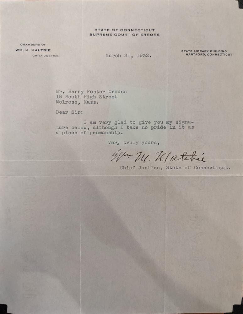 Connecticut Chief Justice W.M. M. Maltbie Signed Letter. 8x11 inches.