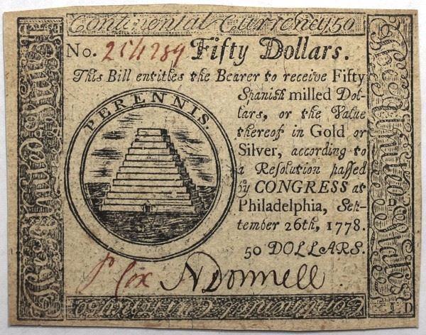 Continental Currency September 26, 1778 $50 Fr#CC-85 S/N 254289 PCGS 58 PPQ.
