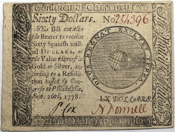 Continental Currency September 26, 1778 $60 Fr#CC-86 S/N 254396 PMG 55.