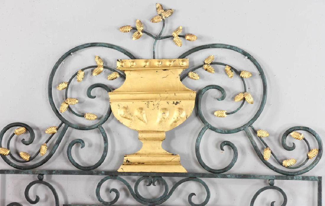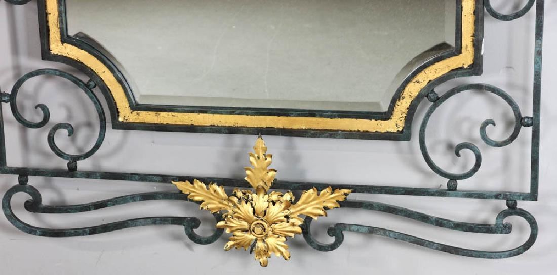 Continental-style wrought iron mirror having gold leaf trim, 67" x 40" Provenance: Wenham, Massachusetts estate.