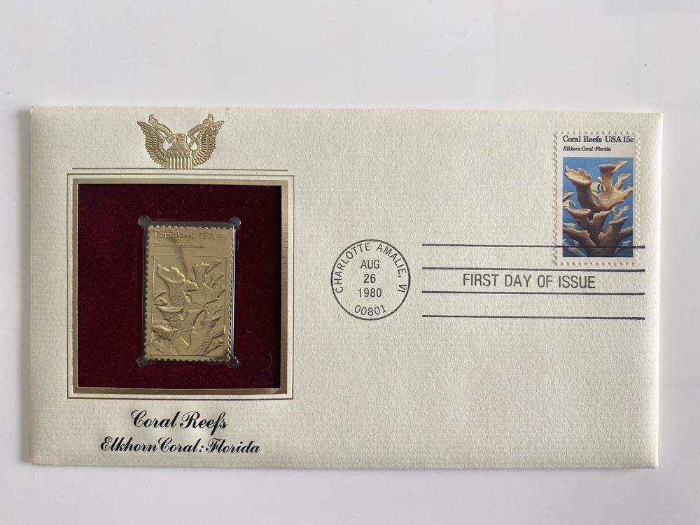 Coral Reefs Elkhorn Coral: Florida Gold Stamp Replica First Day Cover. Charlotte Amalie, VI. Aug 26th 1980. 4x8 inches