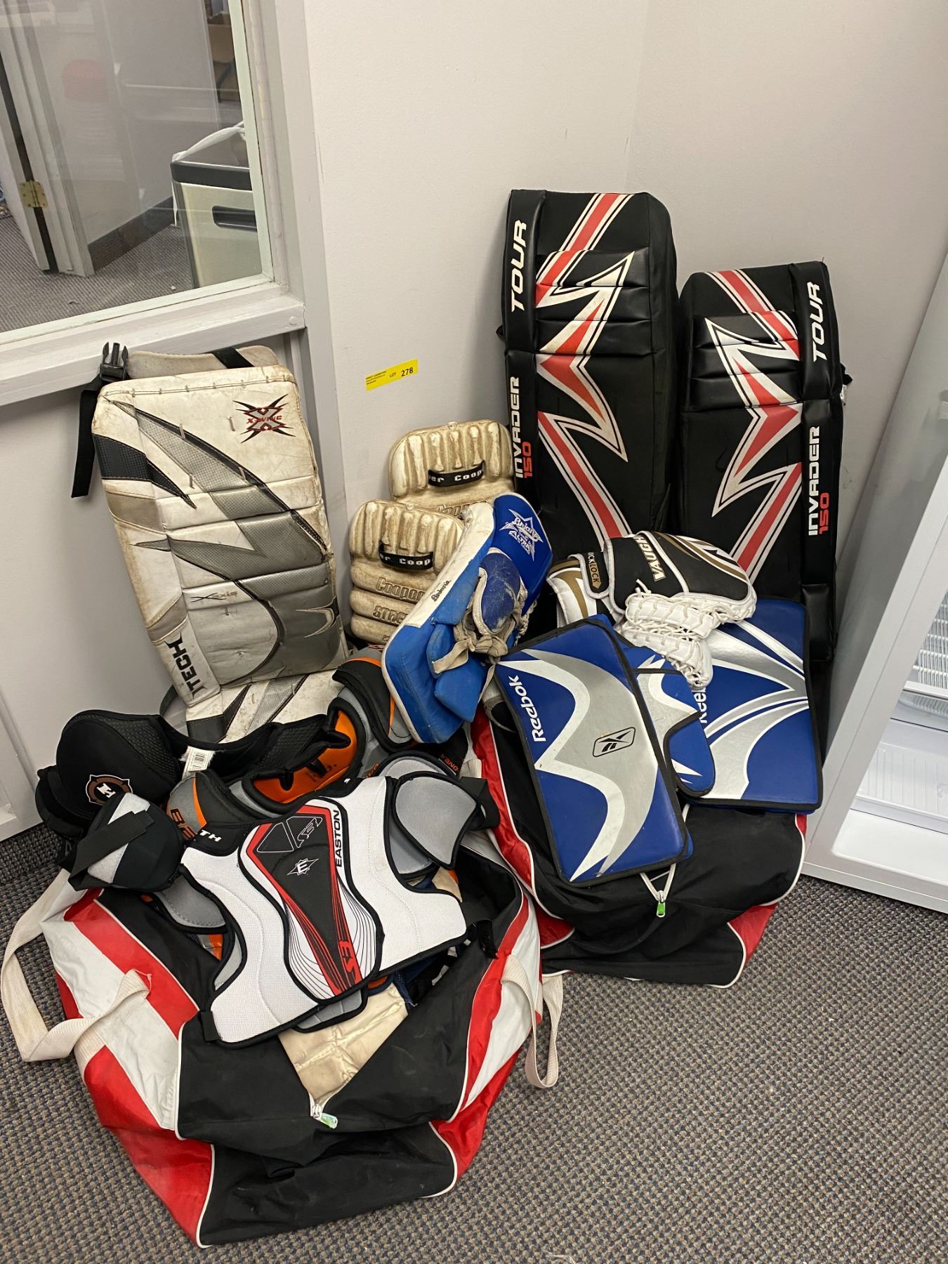 Corner Lot of Misc. Hockey Protective Gear - Goalie Pads and Hockey Bags