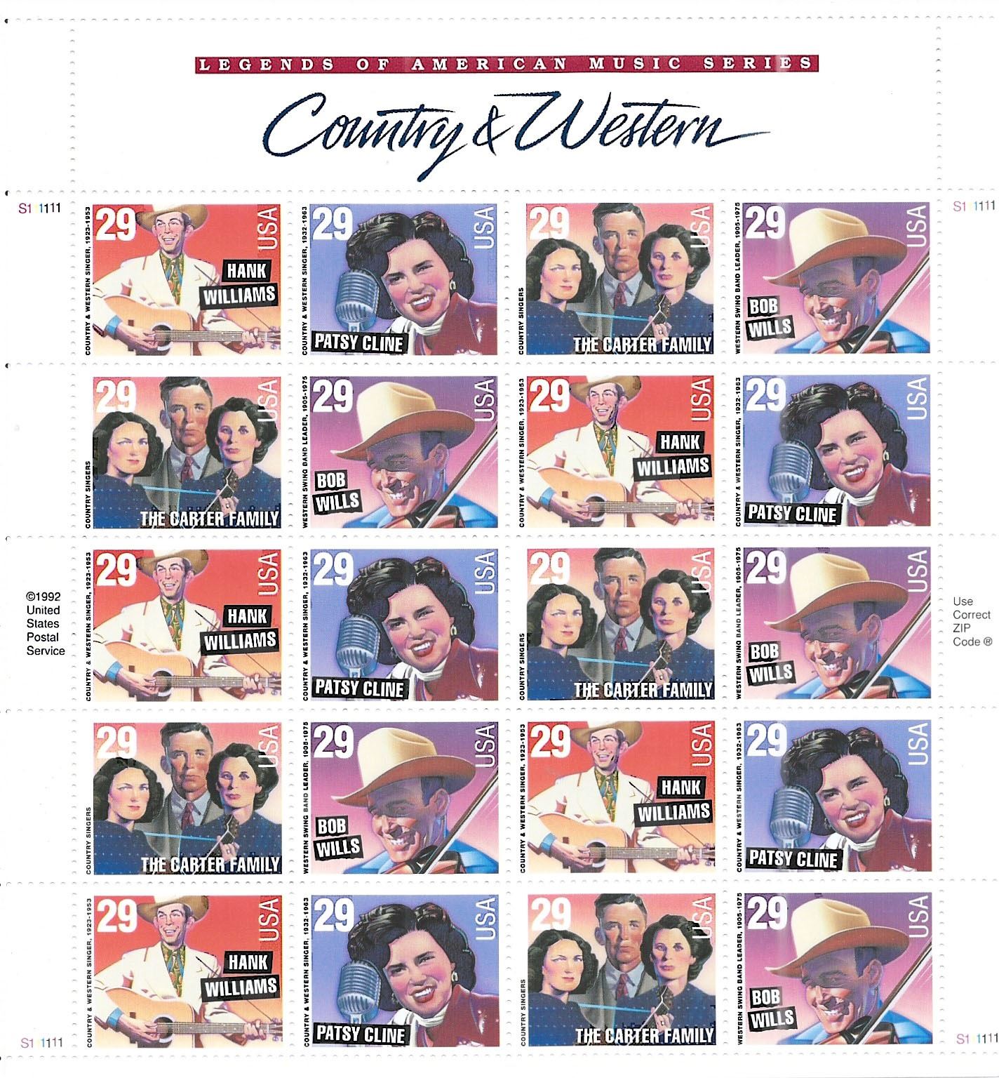 Country and Western Music Legends 29 Cent Sheet of 20 Stamps Scott 2771-74