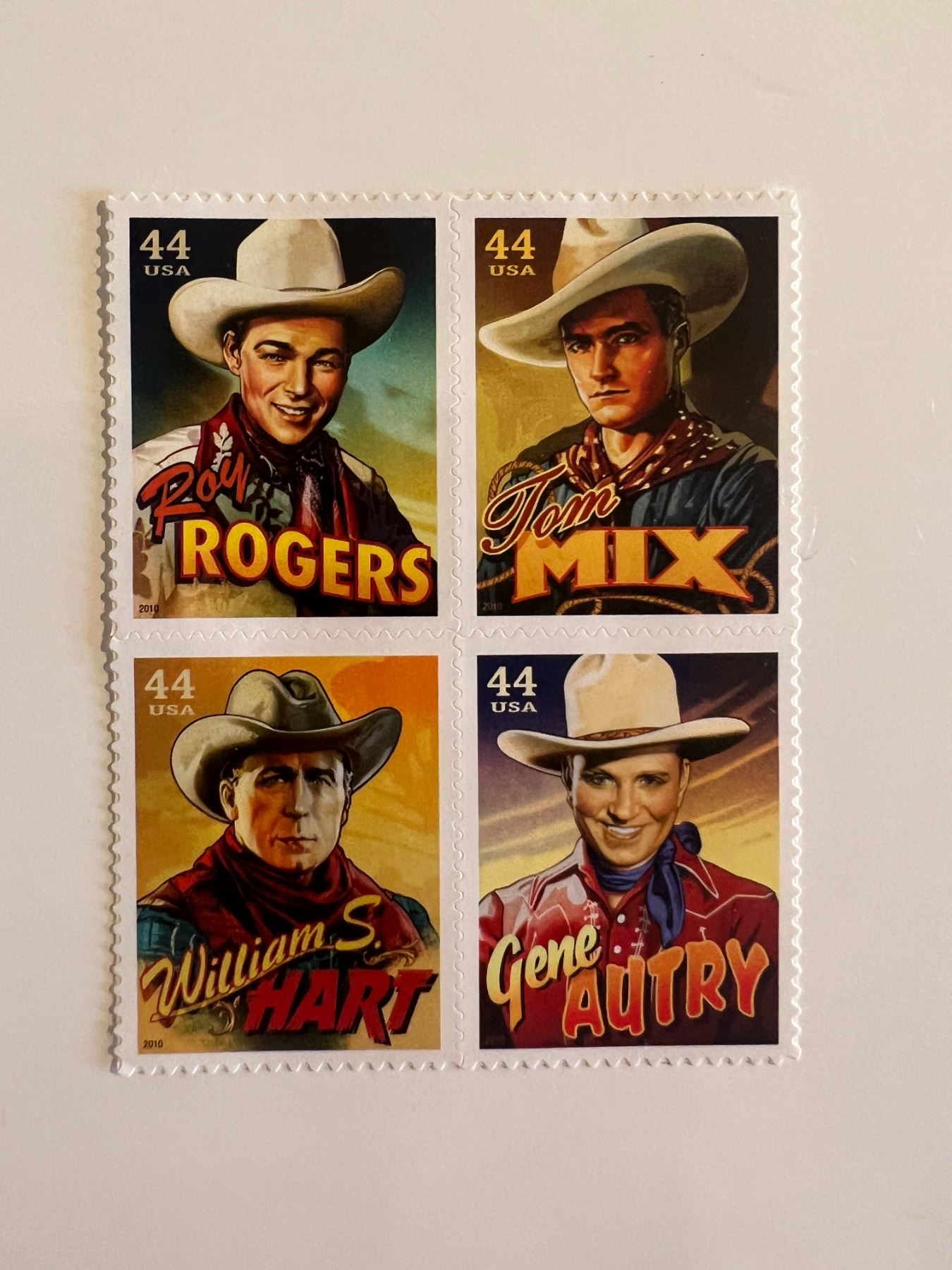 Cowboys of the Silver Screen - Roy Rogers, Tom Mix, William S. Hart and Gene Autry Block of 4 x 44c Stamps - USPS 2010