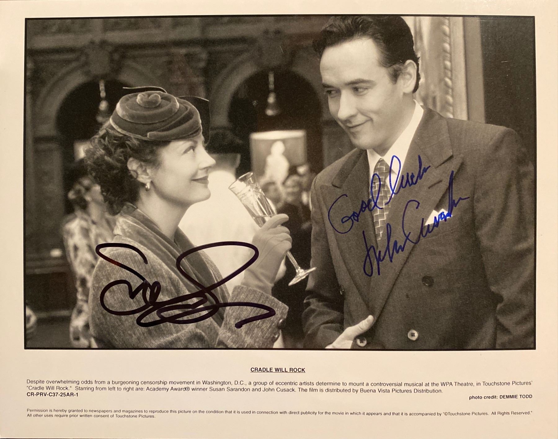Cradle Will Rock signed movie photo autographed by John Cusack and Susan Sarandon. 8x10 inches