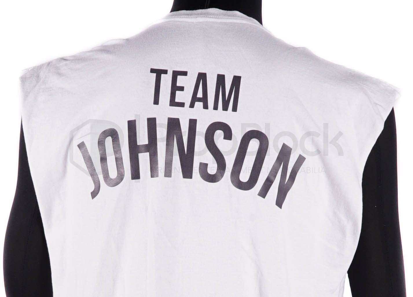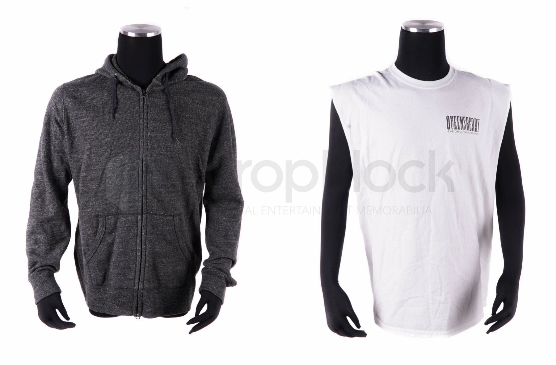 Set of wardrobe featured in the 2015 film Creed. Adonis Johnson (Michael B. Jordan) never knew his famous father, boxing champion Apollo Creed, who died before Adonis was born. This set features a sweatshirt, grey in color with hood and zipper used by Rocky Balboa, actor Sylvester Stallone, and a white undershirt with cut-off sleeves worn by Adonis, actor Michael B. Jordan. Both items can be seen on screen in the film and remain in excellent, production used condition.