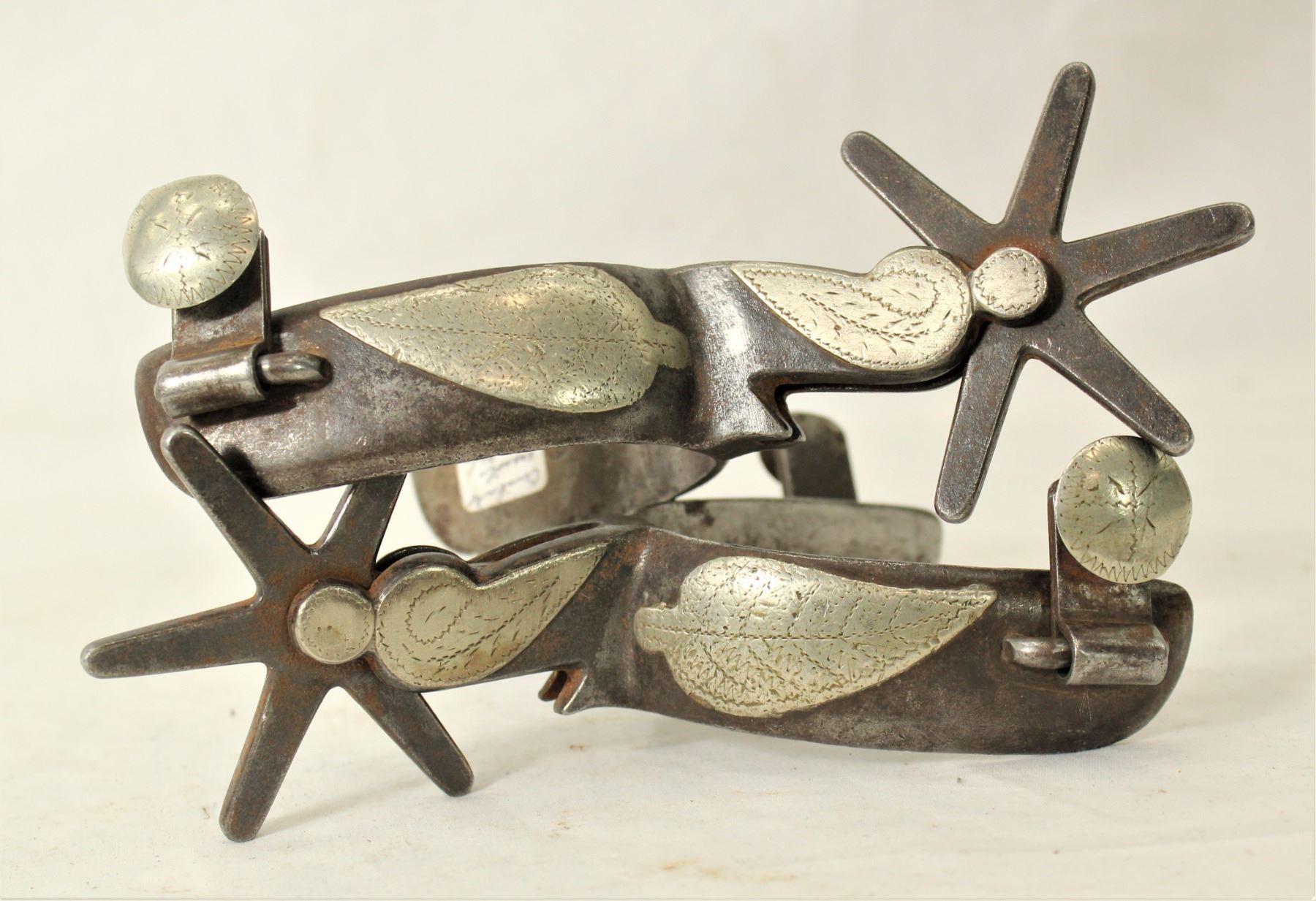 Unique pair of "Juarez" inside marked Crockett single mounted spurs with a great Mexican flavor and look.