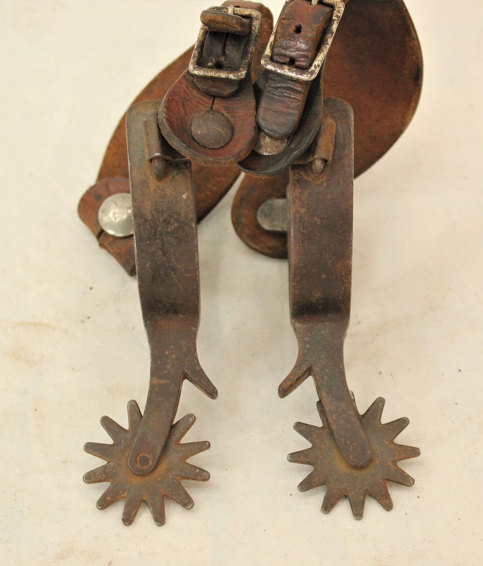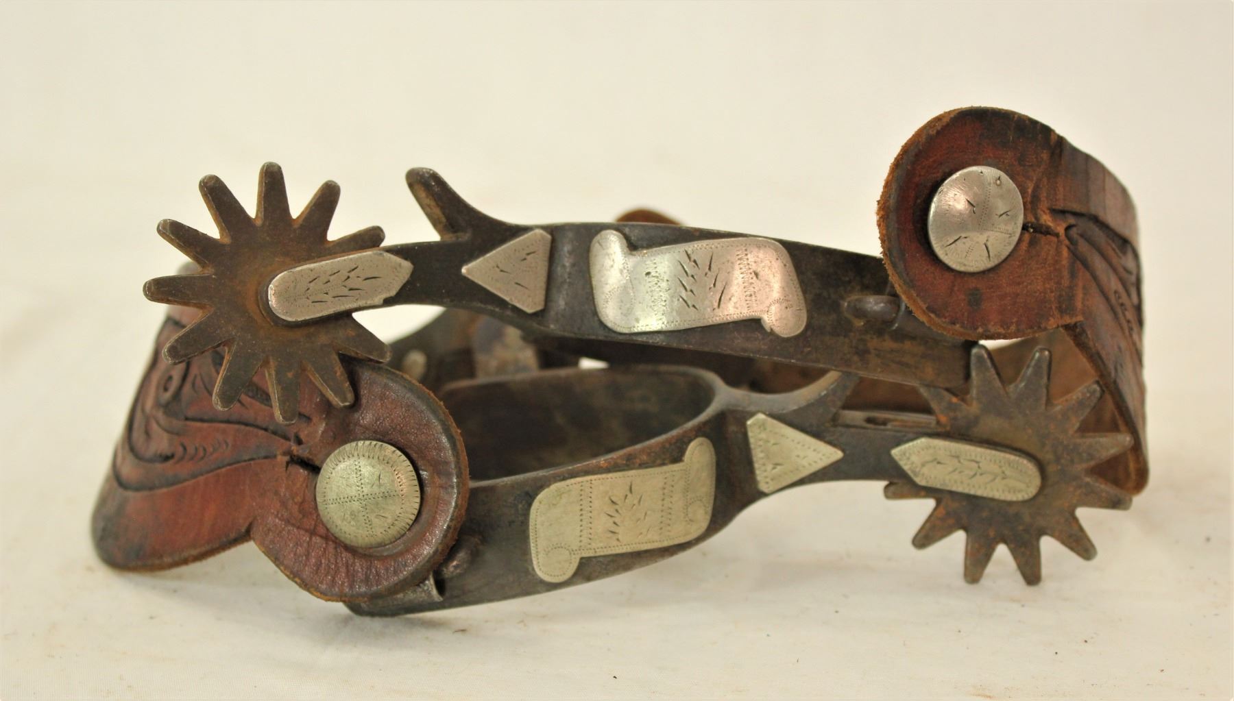 Single mounted Texs style spurs with scrolls and swinging buttons, accompanied by original tooled straps.