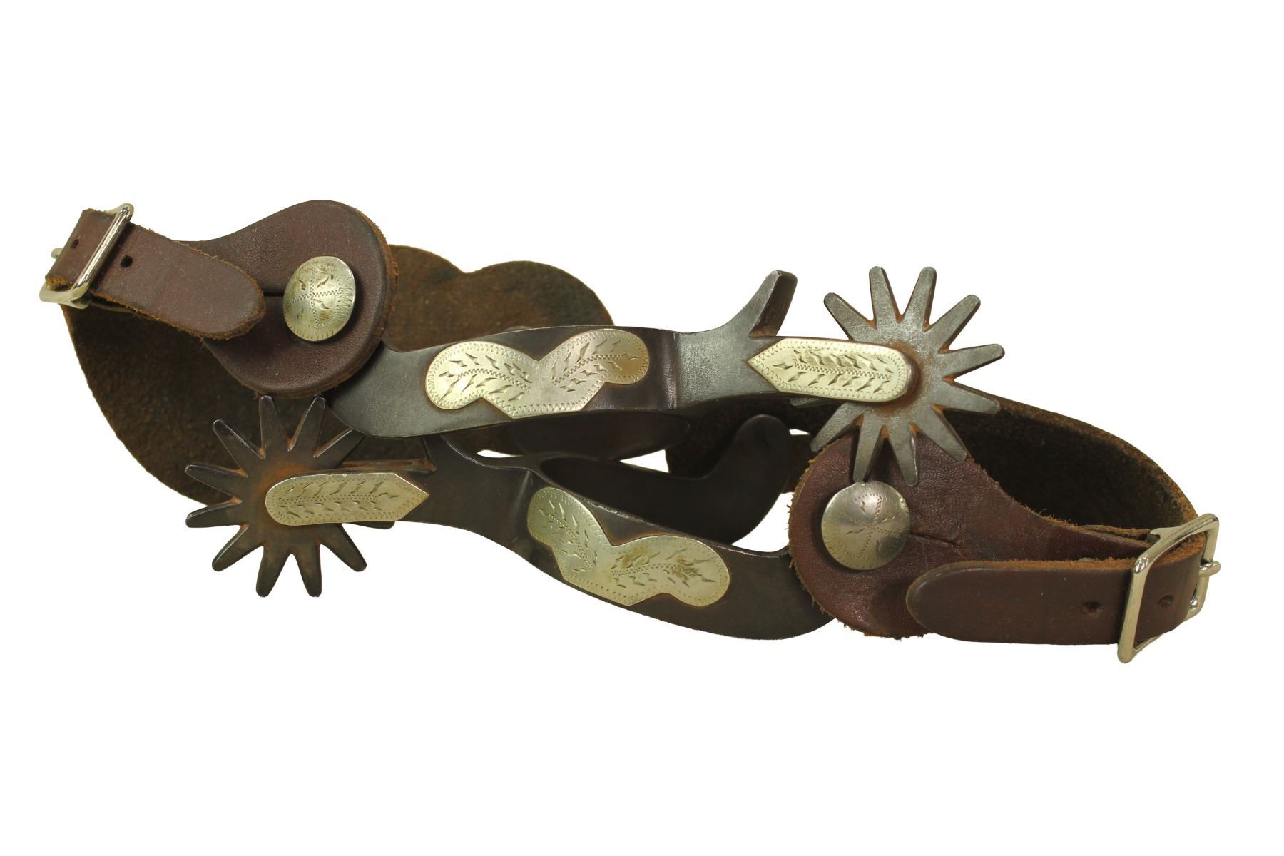 Single mounted pair of Crockett mustache pattern spurs with chap guards and large rowels.