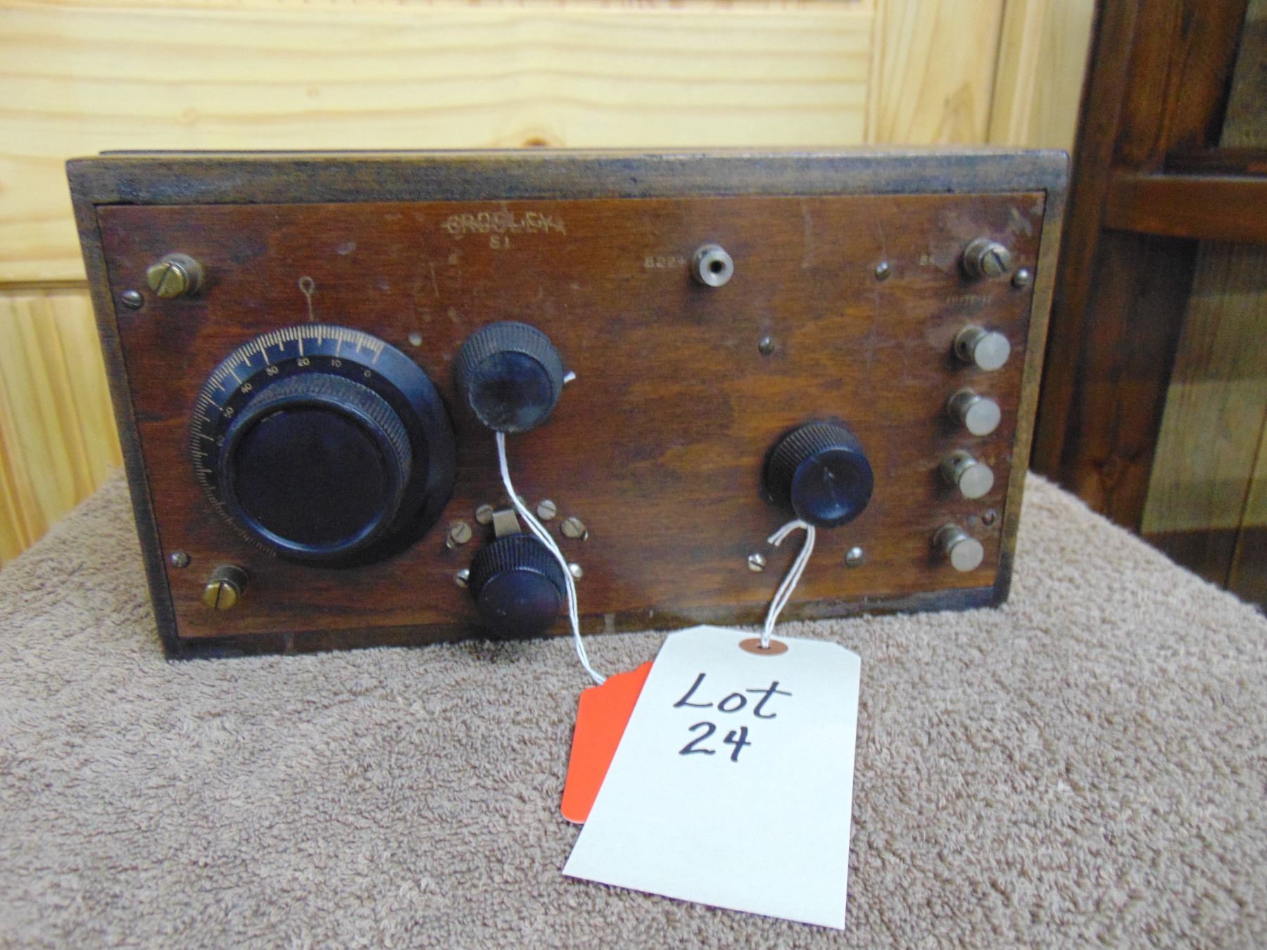 Small wood table set; battery; model 51; two tubes; early wood panel version; tubes display only