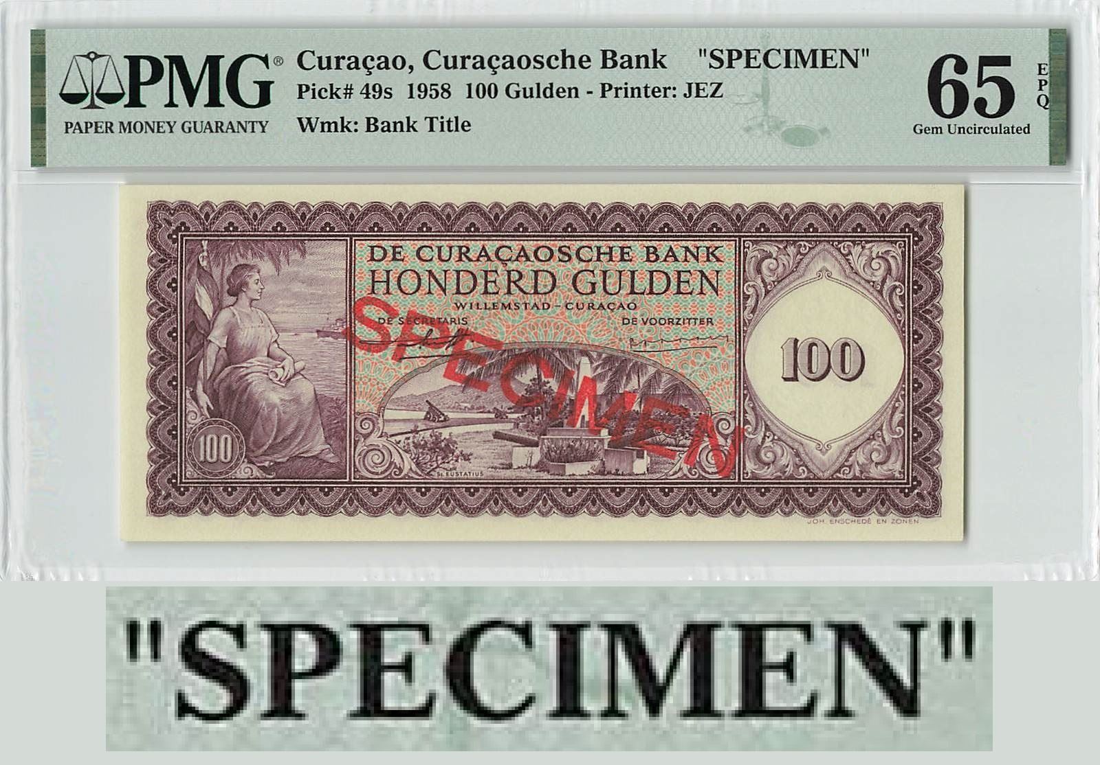 Curacao 100 Gulden 1958 Specimen Pick 49s PMG Gem Uncirculated 65 EPQ