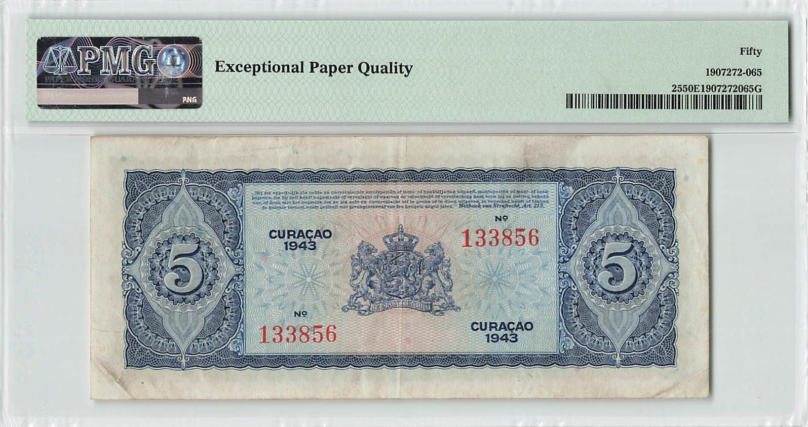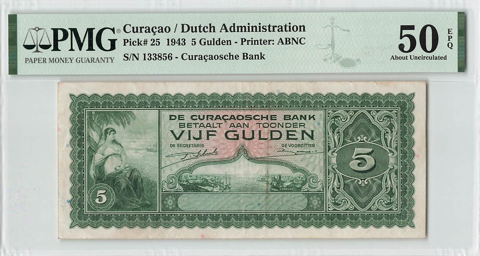 Curacao 5 Gulden 1943 Pick 25 PMG About Uncirculated 50 EPQ