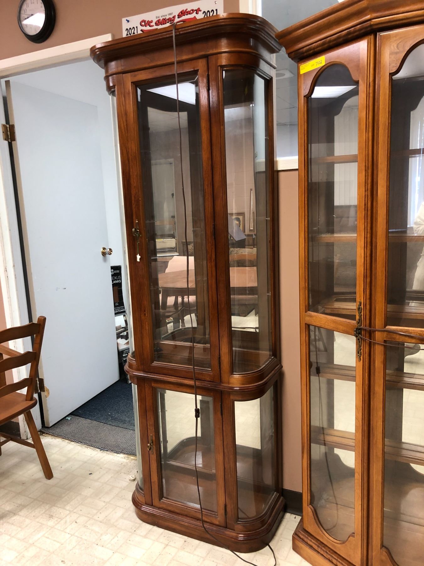 Curio Cabinet with Bent Glass Sides - Great Condition - approx. 28 1/2in x 11 1/2in x 76 1/2in with light - missing shelves
