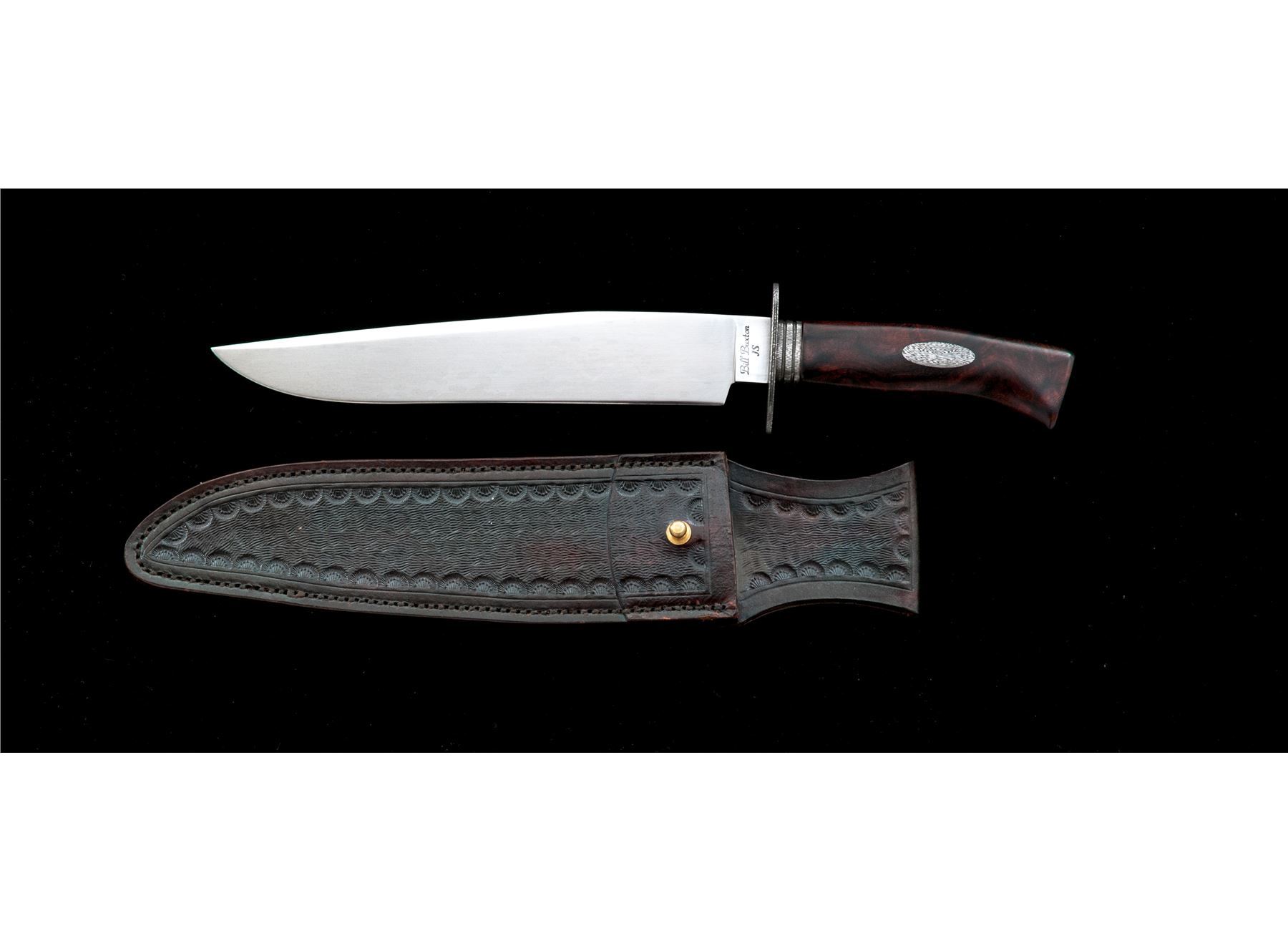 Custom Bill Buxton Fighting Knife, with sheath, 9.25'' drop-point blade with hamon line; marked on ricasso ''Bill Buxton/JS''. Overall length is 14.25'' with hidden tang, damascus guard and ferrule; one-piece desert ironwood handle with an oval damascus shield in each side. In dark brown leather sheath with tooled scalloped design on front. In excellent as new condition, never used or sharpened. Blade with an interesting pattern around the hamon. Ironwood shows only a few very minor handling marks. Sheath is also excellent with a couple of light scuffs and shallow impressions to the backside. Tooled pattern is attractive and of high quality. Est.: $300-$500.