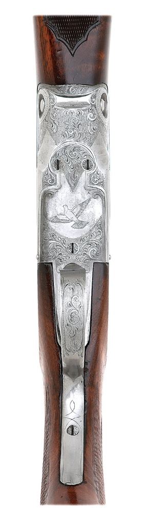 serial #222319, 12 ga (3''), 32'' Simmons ventilated rib replacement barrel choked a tight full with a bright excellent bore showing some stubborn wad residue at the muzzle and a spot of light oxidation in the chamber. The barrel retains about 95% maker applied blue with spots of mild thinning and light wear, the breach area showing a few hints of previous pinprick pitting beneath the finish. The case-hardened frame and forend iron have toned to an attractive pewter gunmetal patina with some hints of gray freckling and the lovely Parker SC Grade engraving remains crisp with punchdot shading, flowing scroll engraving, and a pigeon finely detailed on the underside of the frame. The checkered capped pistolgrip walnut stock is in near excellent condition with softening of the checkering and a few minor handling marks, and features some attractive grain figure, a semi-gloss finish, an adjustable comb, and an adjustable buttplate with a ventilated Pachmayr recoil pad mounted. The target forend is in very good plus condition with a few light handling marks and some scattered chipped points of checkering; the forend is numbered to the gun. The shotgun locks up tight and on-face with the lever coming to rest at center and is sighted with a Bradley-style white bead front and a small white bead midrib. A quite attractive custom Parker Single Barrel Trap, originally made in 1927. (14B11666-5) {C&R} [Casey Collection] (1200/1800)