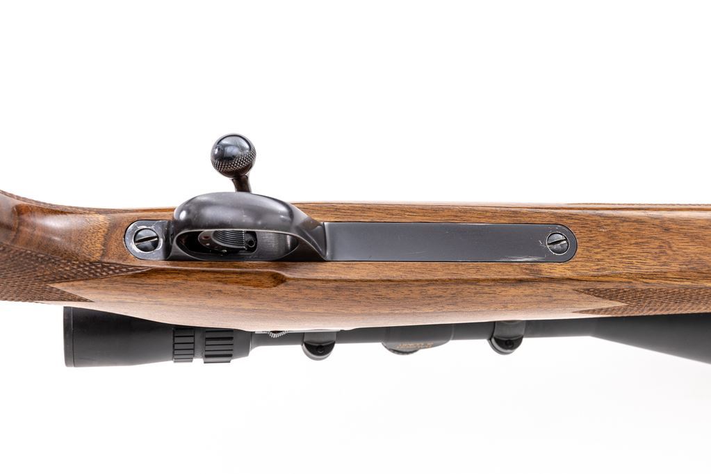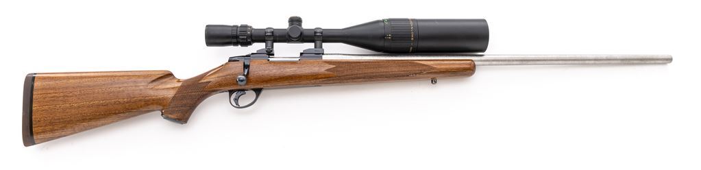 Custom Sako Vixen Bolt Action Rifle, with Bausch & Lomb Scope, L-461 Action, #156883, .17-222 cal., 26" tapered stainless barrel, remaining metal has a blue finish. One-piece checkered walnut stock with pistol grip, cheekpiece, solid brown rubber Pachmayr Old English recoil pad, plain metal grip cap, and sling swivel studs. Adjustable trigger with added shoe. Barrel mfg'd without sights and marked on left side near the receiver ".17/222". Topped with a Bausch & Lomb Elite 4000 4-16x scope. Scope has a matte black finish, duplex reticle, and sunshade. Condition is excellent with approx. 95% blue remaining. There are some light scratches and wear to the trigger guard. Wood with intermittent light handling marks and a few small and shallow impressions, the most noticeable at the tip of the fluted comb; checkering is sharp. Action operates smoothly, bore is bright with crisp rifling. Scope rates in excellent condition with bright, clear optics. Est.: $1,000-$1,500. (Modern)