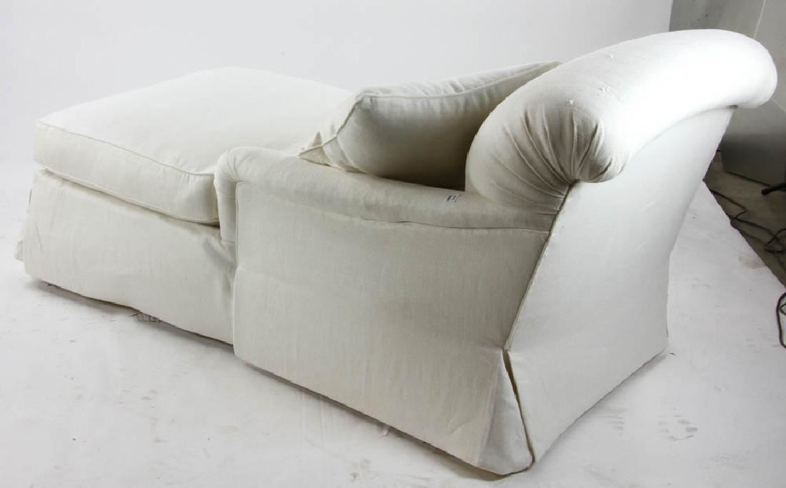 Custom linen-upholstered chaise lounge, 32 1/2" H x 58" L x 30" D. Provenance: Vero Beach, Florida estate.