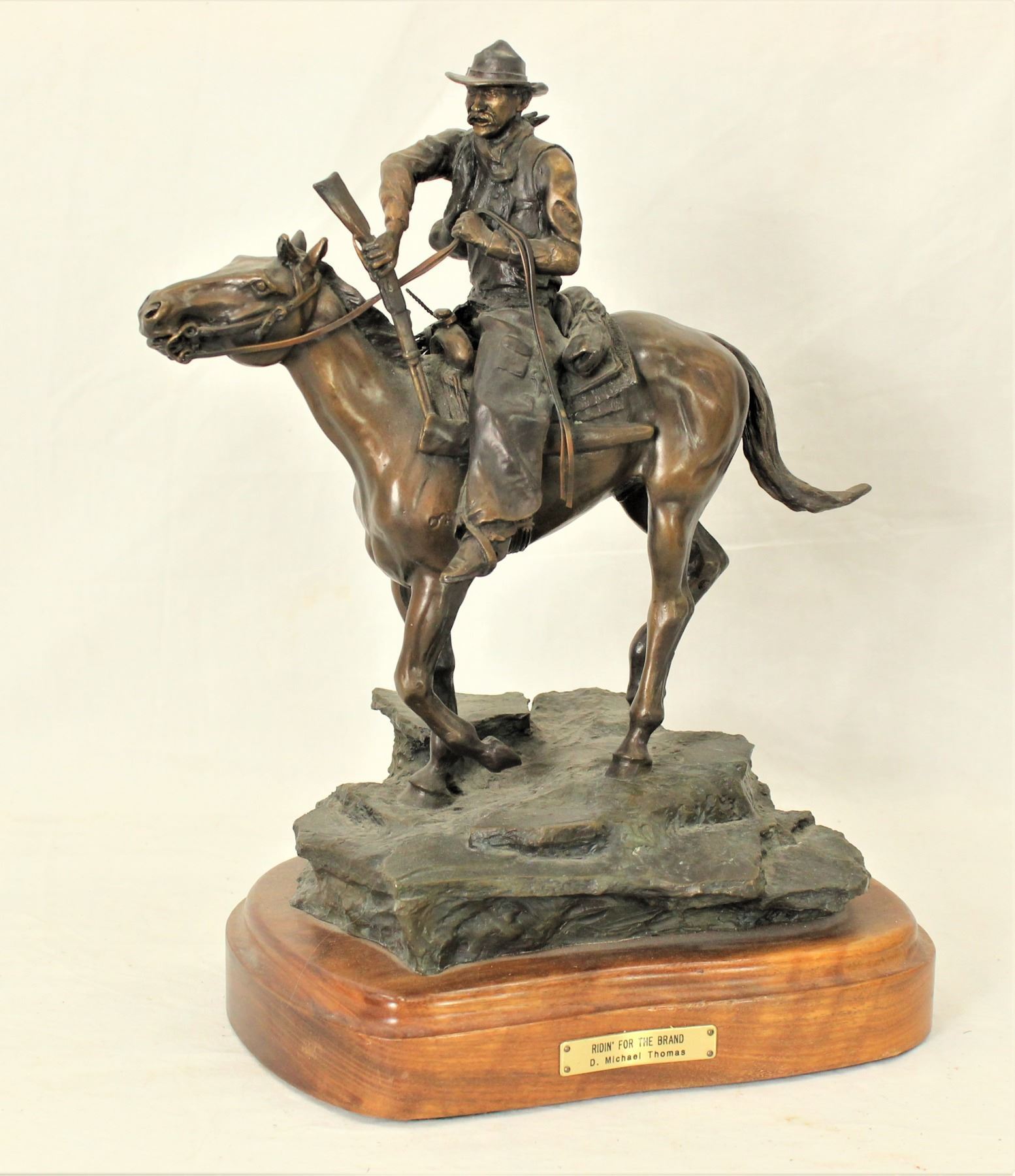 Fine western action bronze, titled "Ridin" For The Brand", 15" tall and 12" long.