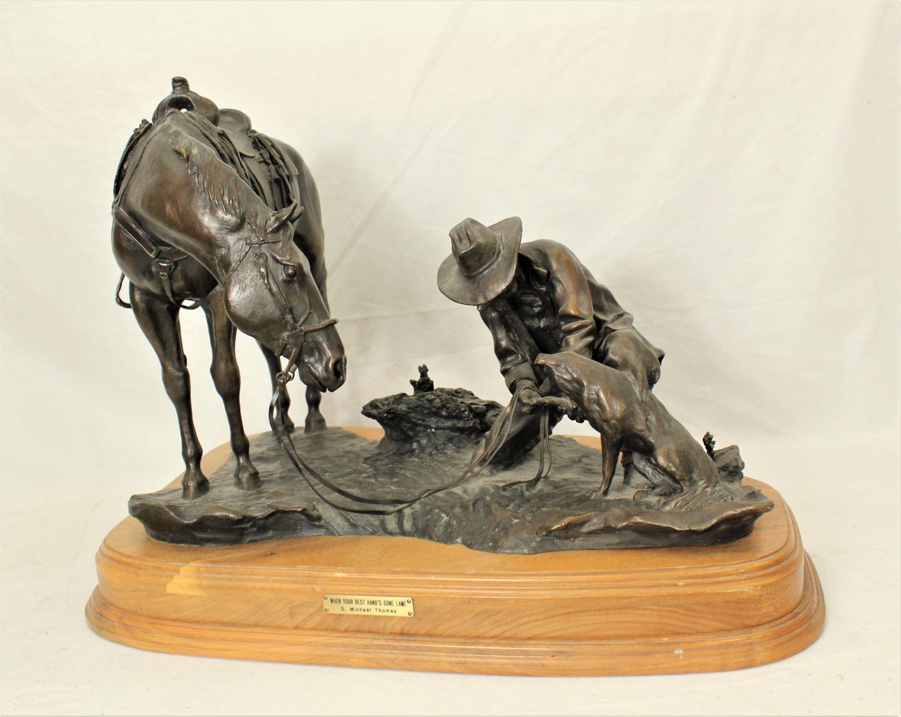 A detailed bronze depicting western image, titled "When Your Best Hands Gone Lame", dimensions 16" tall by 20" long.