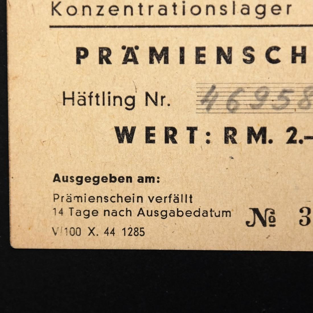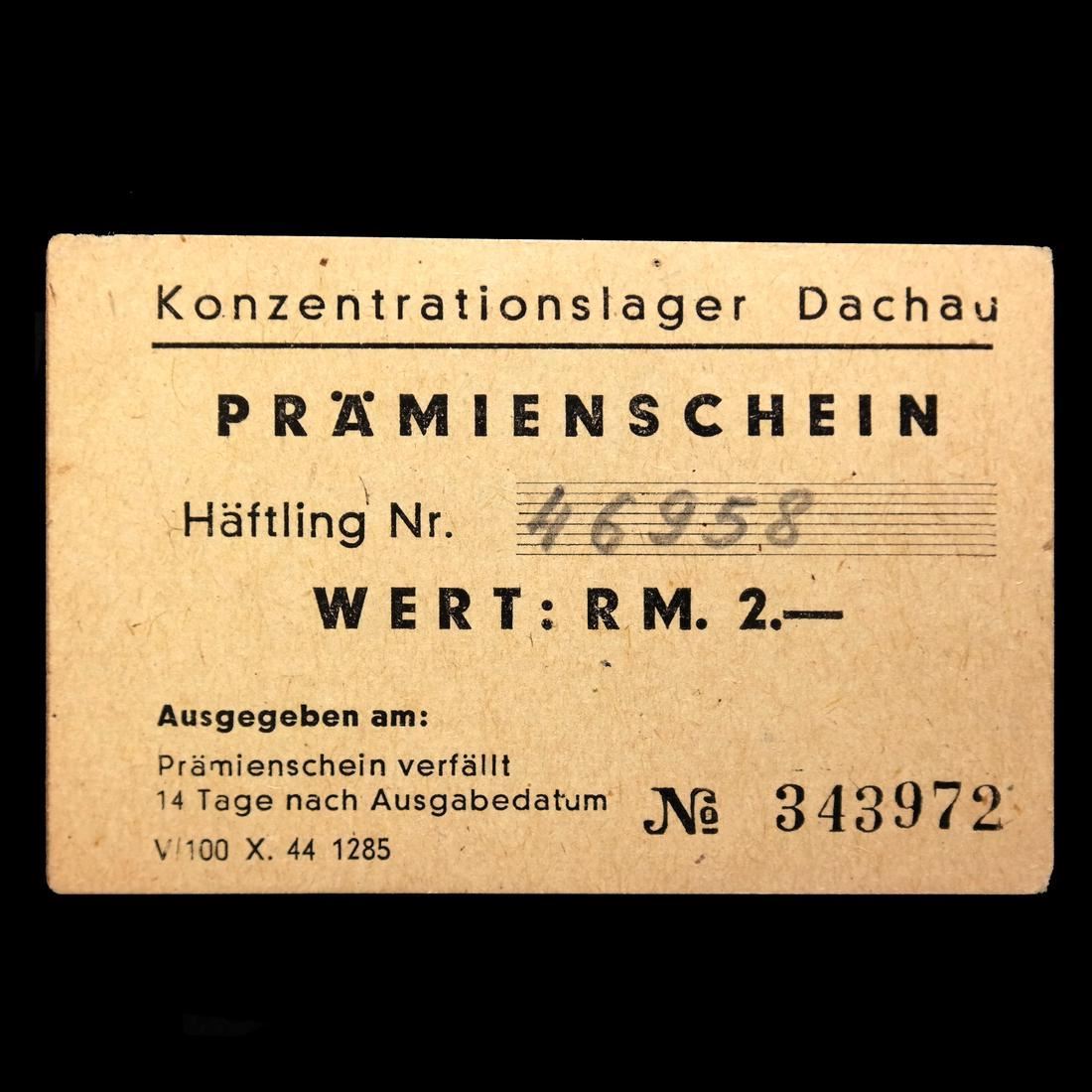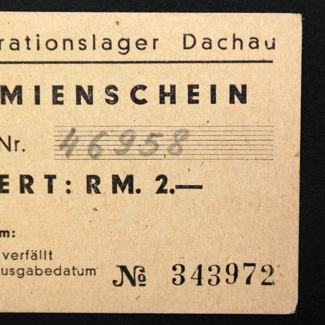 Konzentrationslager Dachau / Prmienschein / Wert: RM. 2.- on cream paper, serial #343972, prisoner #46958 in pencil, measures approx 75 by 50mm, natural paper pinhole, VF.
