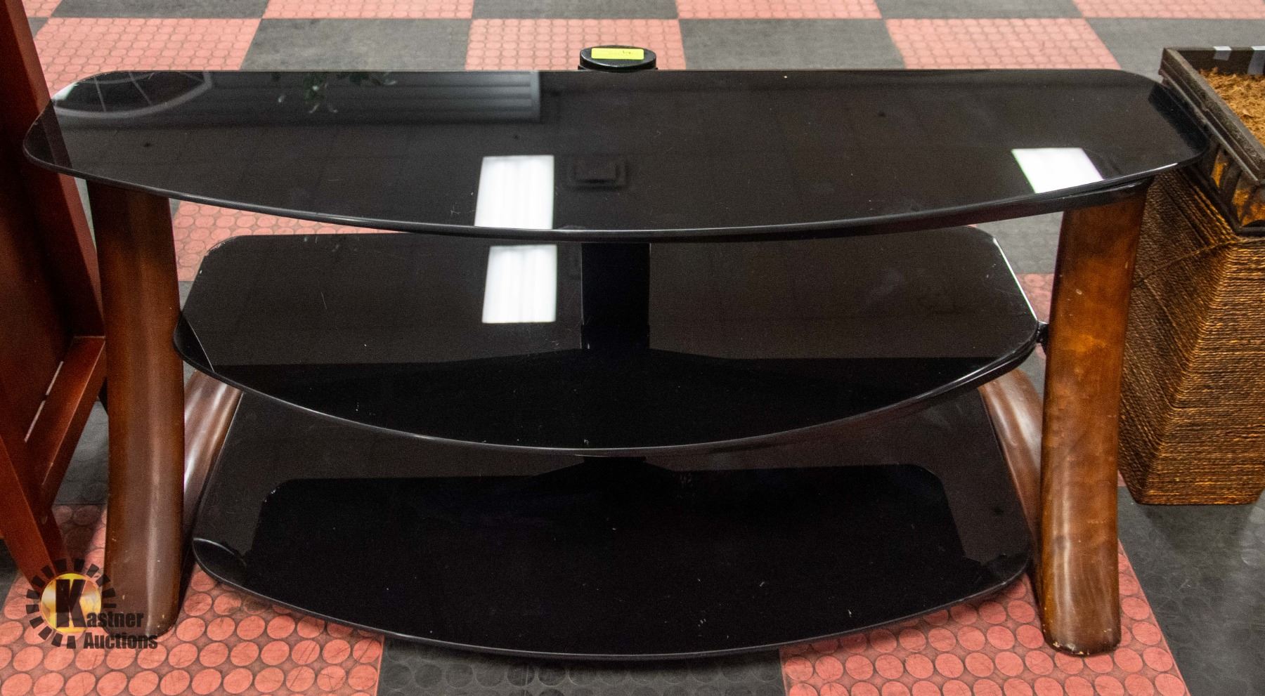 STAND - 3 TEMPERED GLASS SHELVES, BENT WOOD AND BLACK METAL FRAME (52"L X 21"W X 22.5"H) **ALL ITEMS MUST BE REMOVED BY 5PM SATURDAY, OCTOBER 12TH 2024. ALL REMAINING ITEMS WILL BE SUBJECT TO A $6.00 PER DAY STORAGE CHARGE. ANY ITEMS REMAINING AFTER MONDAY, OCTOBER 27TH 2024 WILL BE CONSIDERED FORFEITED. NO REFUNDS WILL BE ISSUED FOR FORFEITED ITEMS. TO SCHEDULE A PICK UP APPOINTMENT CLICK HERE