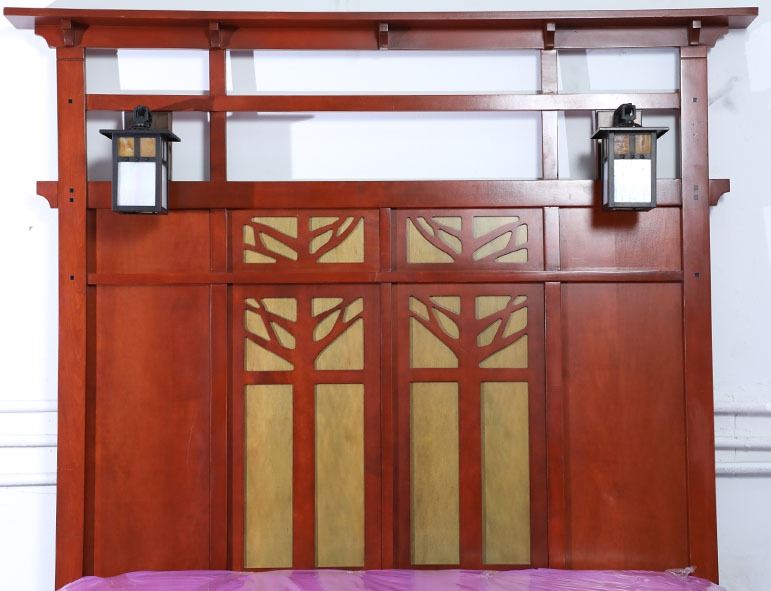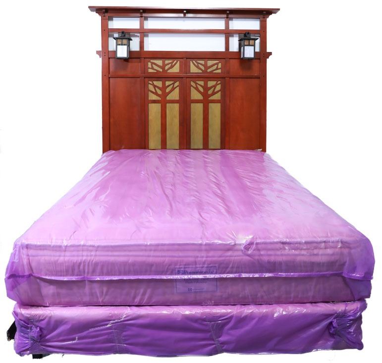 (Disney California Adventure, c. 2000's). A Disney California Adventure, Grand Californian hotel room bed frame and lamps, as used by guests. The frame with lamps are in good working condition with normal wear from age and hotel use, including minor edge and surface wear. This is the first time an original mattress is included with the bed frame. The matters has pink plastic rap around it, which is how it came from the hotel. This is a Queen size bed/mattress. Item comes with a Grand Circle Tour Auctions COA.