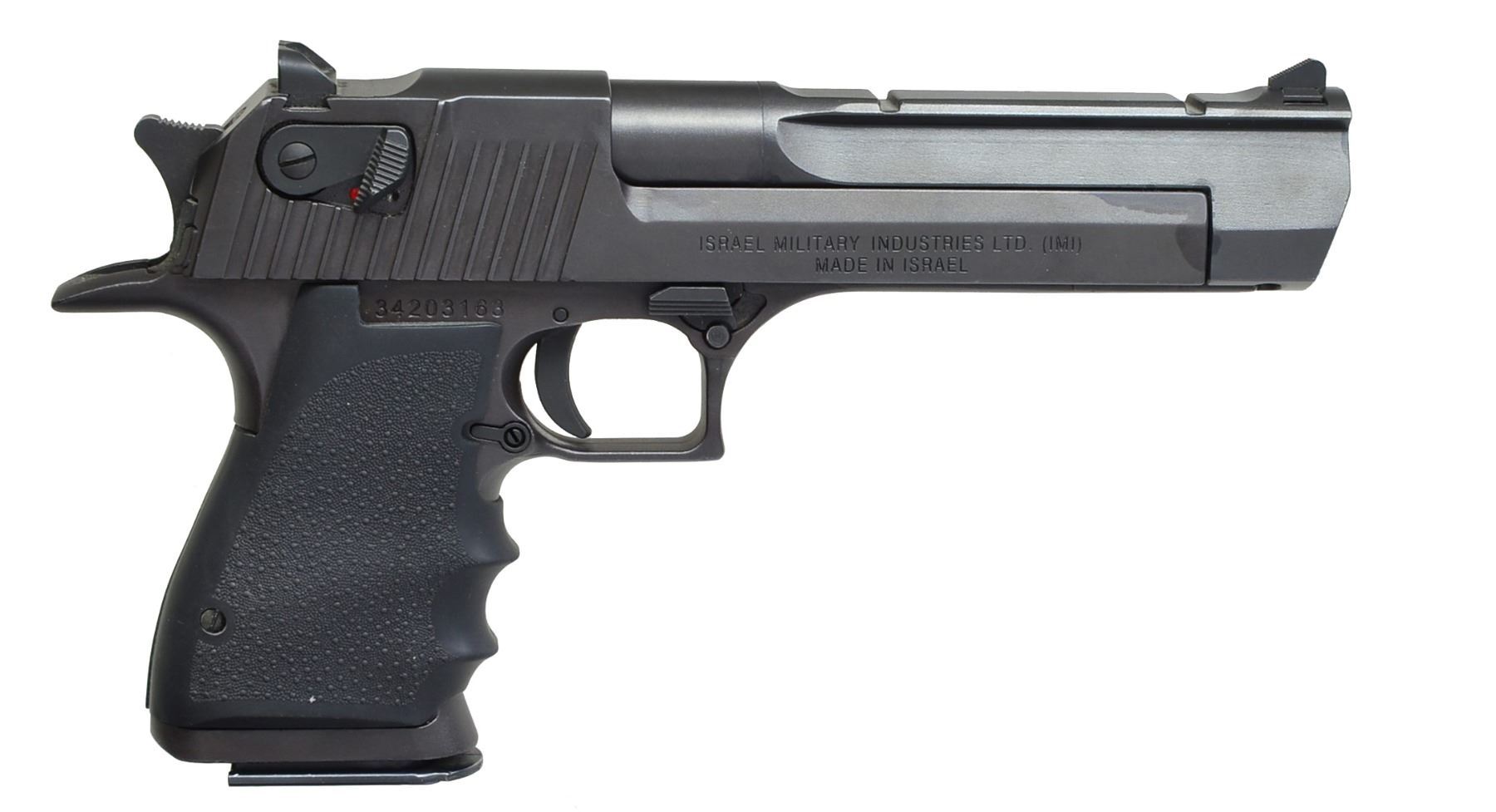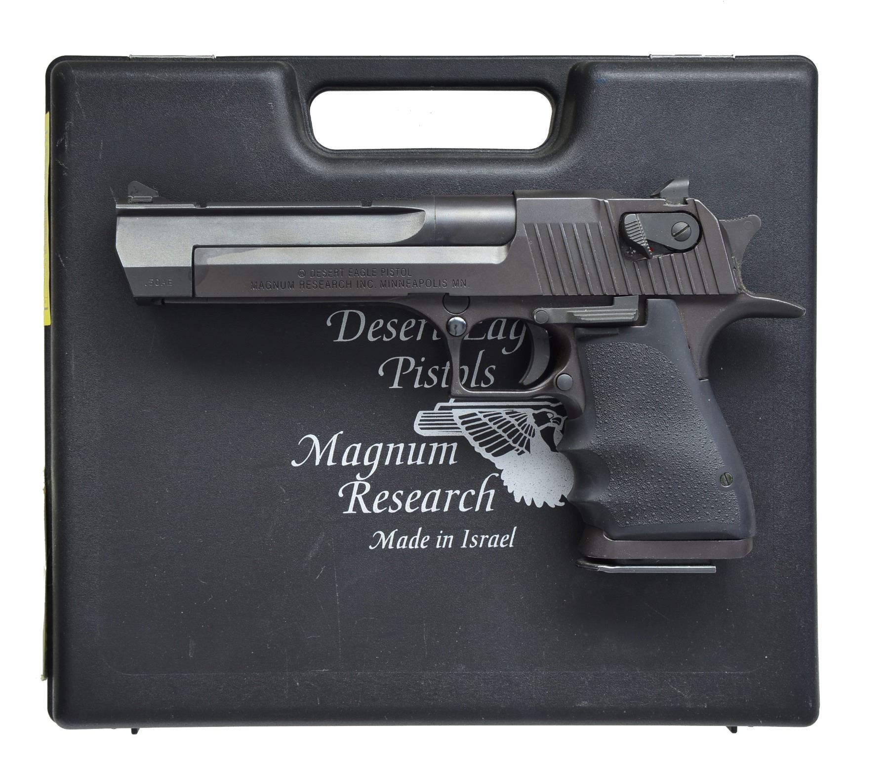 Cal. 50 AE. Bbl. 6". S# 34203163. If you woke up this morning & decided you wanted the most iconic, largest carry gun in your social circle you may have been picturing the 50 cal. Desert Eagle. Weighing in at over 4 lbs., 6 oz., this behemoth is as impressive to look at as it is on the firing line. Matte black finish w/ rubber wraps around grip. Drift adj. front & rear combat sights w/ a radius of 8 1/2" on a serrated slide w/ a 3 1/2" mounting area at 12 o"clock on the bbl. Ambidextrous safety. Gas operated rotating locking bolt system. Rifling is a right hand, six rib, polygonal style, one turn in 19". MAG: 1 - 7 rd. mag. UNATTACHED ACCESSORIES: accompanying this lot is the original shipping / transport box, owner"s paperwork, stickers, gun lock, disassembly tool & fired casing. CONDITION: aside from normal fouling on the gas piston, this pistol could have snuck through as new. The finish coverage is complete throughout w/ very few minor spots that indicate gentle use. Bore is bright & shiny. Fire control mechanism appears to function correctly when cycled by hand. (20-1241/JZ). MODERN. $1,000-1,500.