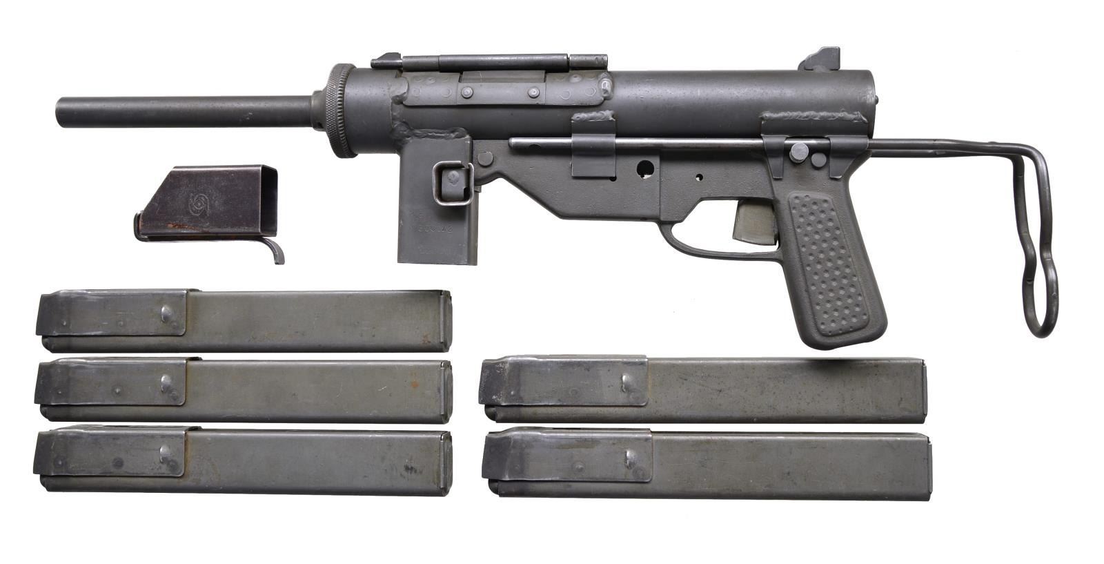 Cal. 45 ACP. S# M300142. Bbl. 8". The M3 grease gun was first adopted by the United States military in the early 1940’s. During WWII, the general motors corp., Guide Lamp division, produced just under 650,000 M3 & M3-A1 grease guns. Unlike 45 ACP SMGs at the time, the grease gun was intended to be mass produced w/ very loose tolerances ensuring fit & function over multiple platforms. Guns available prior to the introduction of the grease gun, such as the Thompson SMG & Reising, were complicated & expensive to manufacture w/ several machined parts & a lot of necessary hand-fitting. The grease guns design is a simple blow back operated, open-bolt firing mechanism utilizing a tubular receiver which was far less expensive & much easier to manufacture in lg. numbers. The original M3 was cocked by utilizing a spring loaded lever mounted on right side, rear of the mag. well. The M3-A1 model, similar to this example, was simplified even more by removing the necessity of a cocking lever, substituting a slot cut into the bolt & operated by the finger of the shooter to perform the same task. This particular example is a transferable SMG mfg. by Fleming Firearms on what appears to be a Broadhead design. All exposed metal surfaces are parkerized. The dust cover, as w/ the originals, serves two purposes: one, as the name indicates is to keep foreign debris from entering the ejection port w/ the secondary purpose of proving a sort of safety by means of obstructing the bolt from closing when in use. Front sight is fixed, exposed blade. Rear sight is a nonadj. peep. 2-Position telescoping wire buttstock. Left side markings include “M3C, M300142” & what appears to be an earlier “Broadhead” marking that was very shallow & mostly illegible. Right side markings include what appears to be an original Guide Lamp number on dust cover “GL B 7161922”. Mag. well is marked “HT ARMORY P / SMYRNA GA”. MAGS: 5-30 rds. UNATTACHED ACCESSORIES: Cobray mag. loading tool. CONDITION: overall exterior finish is parkerizing w/ complete coverage & gently patinaed as is typical w/ these guns. Bolt travel is smooth properly engages dust cover mechanism. Collapsible stock works smoothly & locks correctly in every position. Shiny bore w/ visible rifling. Fire control mechanism appears to function correctly when cycled by hand. NATIONAL FIREARMS ACT MG REQUIRING BATF TRANSFER BEFORE TAKING POSSESSION. FULLY TRANSFERABLE. (03-1492/JZ). MODERN CLASS III. $6,500-8,500.