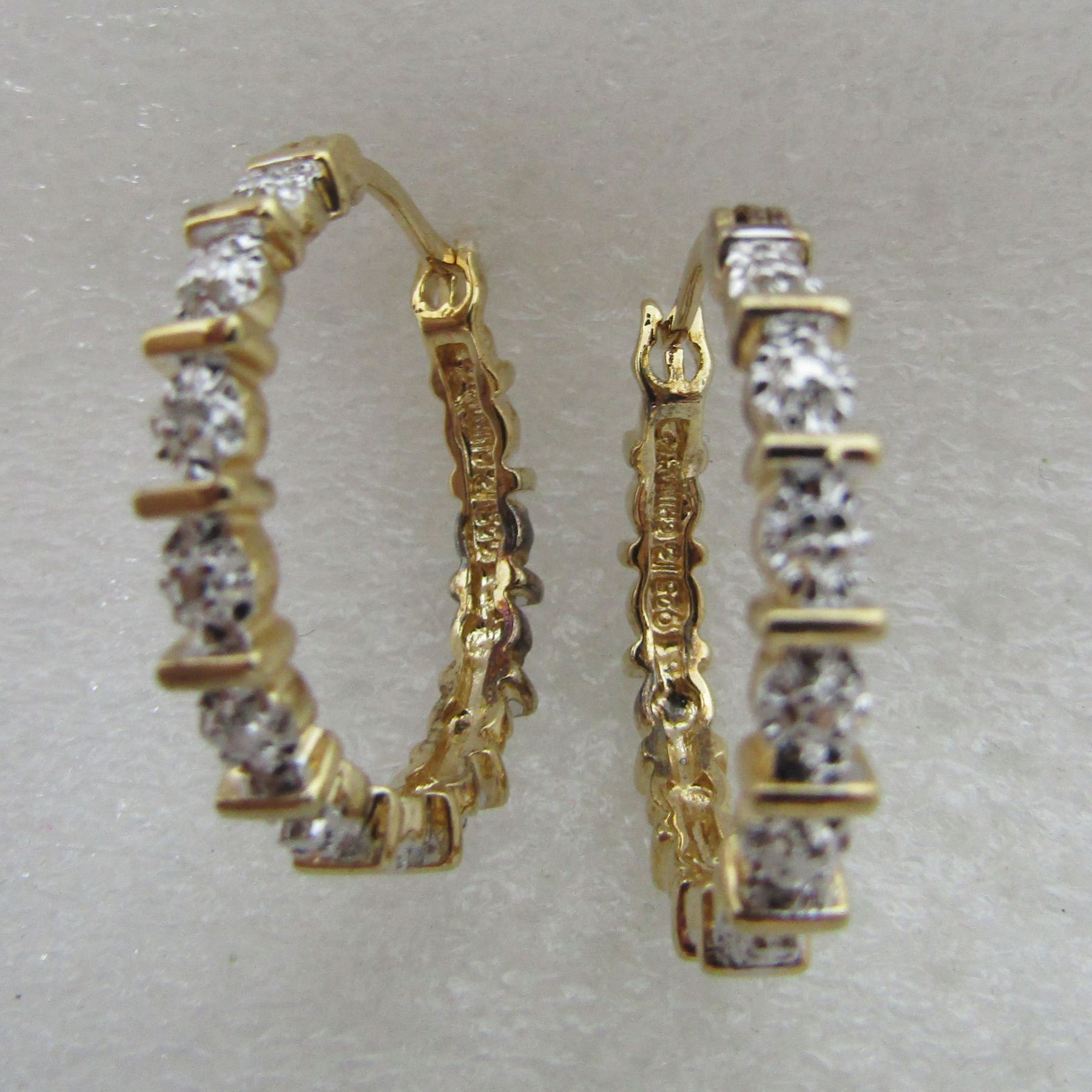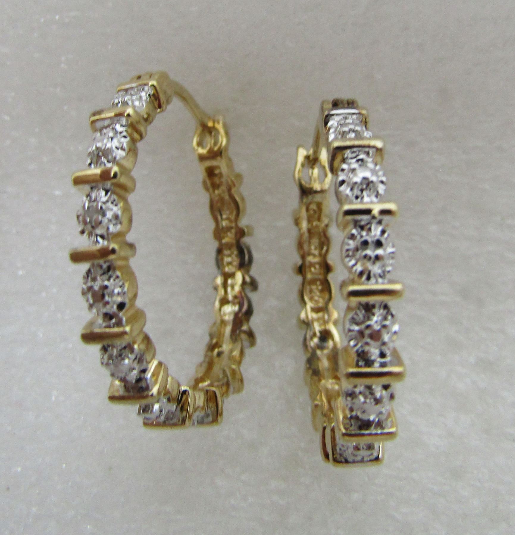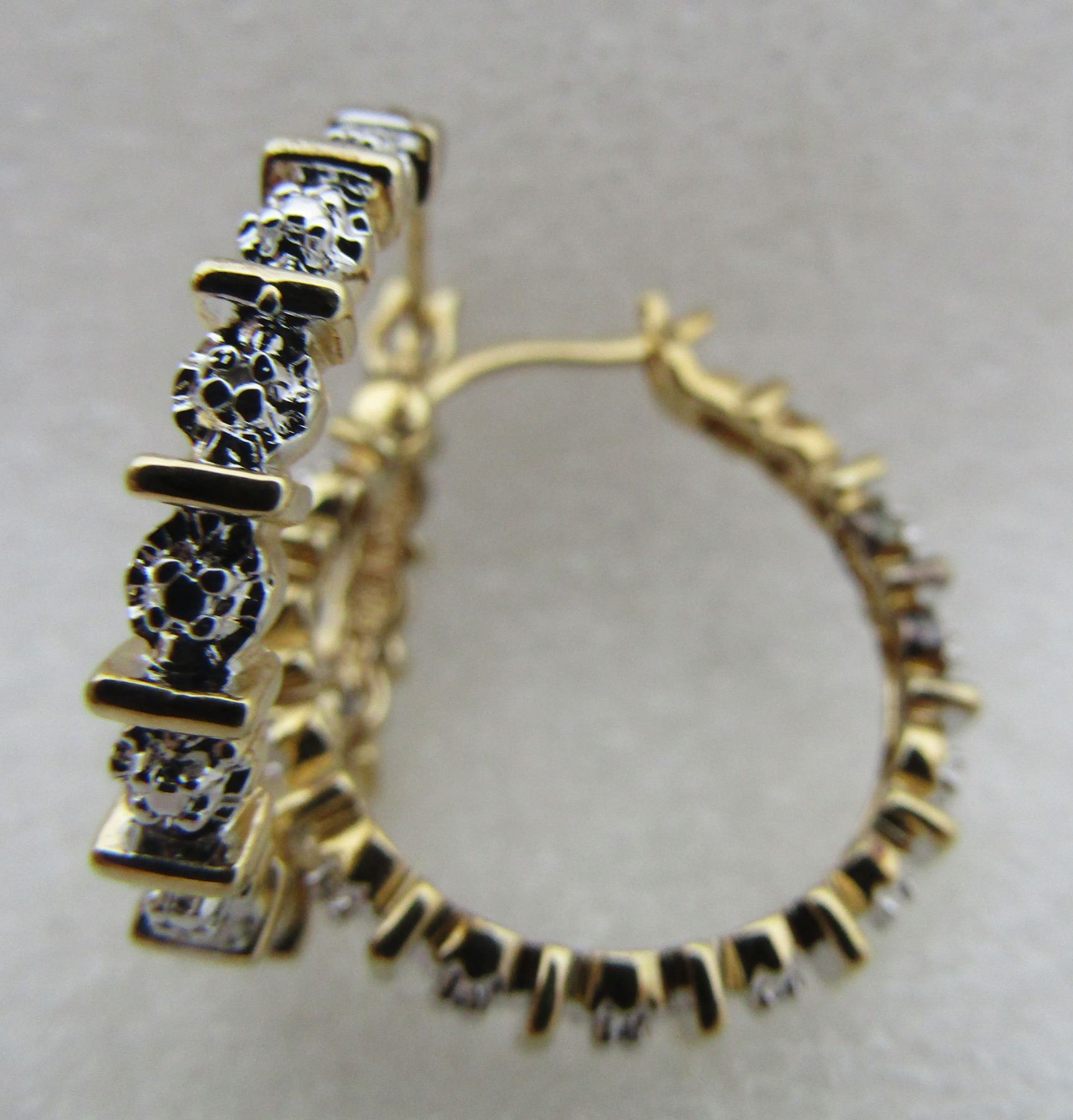 STRAIGHT LINE HOOP EARRINGS VINTAGE ESTATE HALLMARKED "R" YELLOW GOLD ON STERLING SILVER WITH TWO ACCENT DIAMONDS. 25MM WIDE BY 4MM THICK. WEIGH 5.4 GRAMS. EXCELLENT USED CONDITION. USA SHIPPING $5