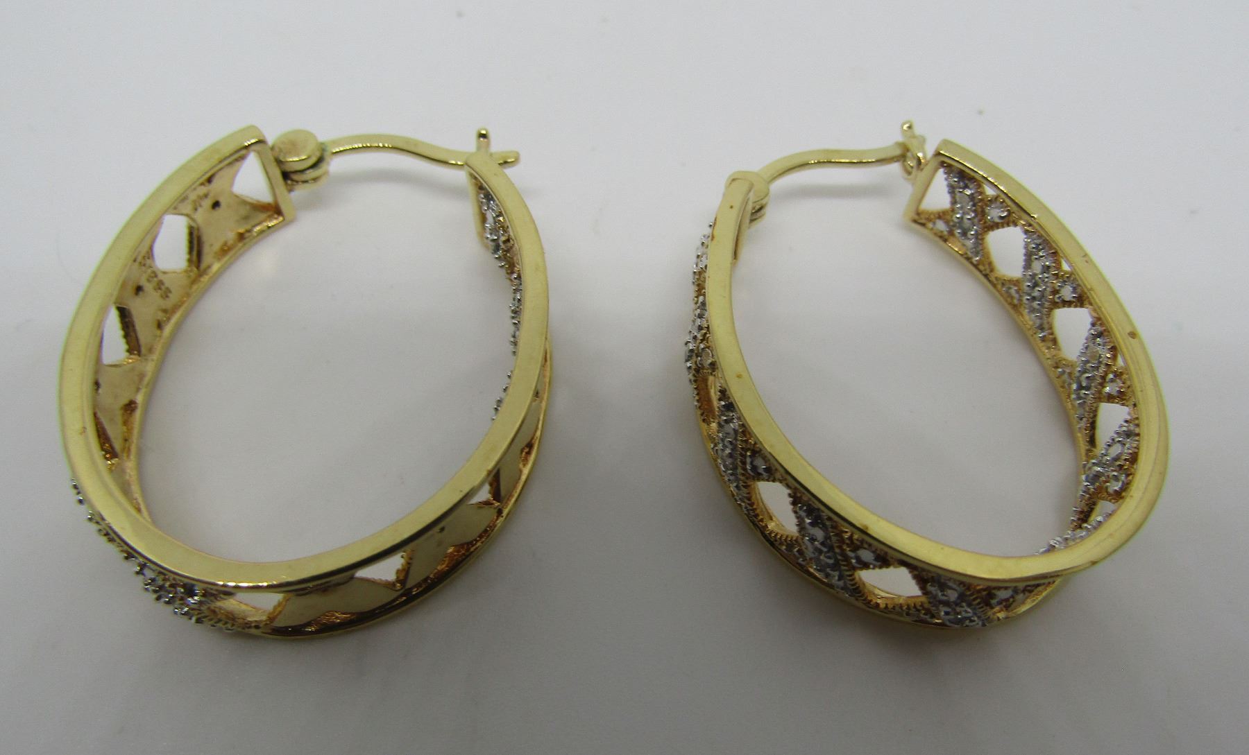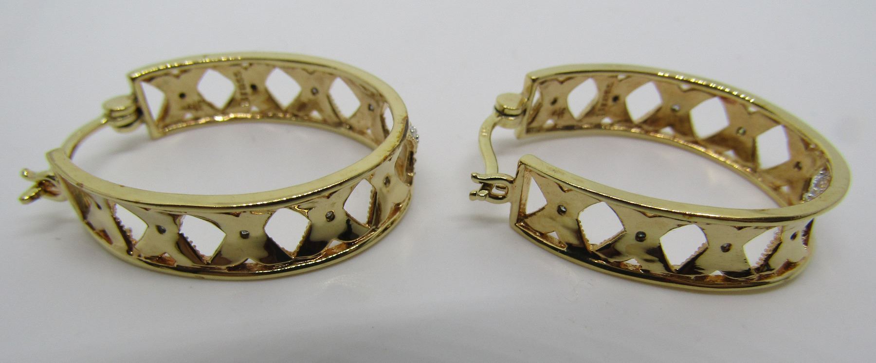 INSIDE AND OUTSIDE DIAMOND HOOP EARRINGS VINTAGE ESTATE. YELLOW GOLD ON BRASS WITH STERLING SILVER WIRES. WITH 20 ACCENT DIAMONDS. 31MM LONG BY 24MM WIDE BY 7MM THICK. WEIGH 6.2 GRAMS. EXCELLENT USEDCONDITION. USA SHIPPING $5