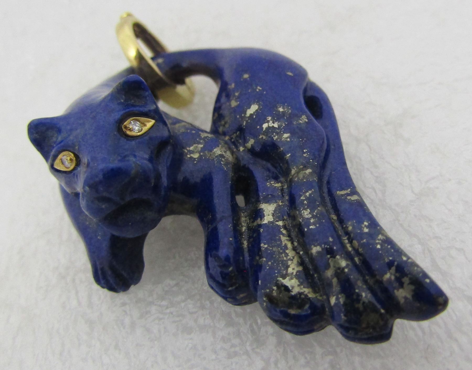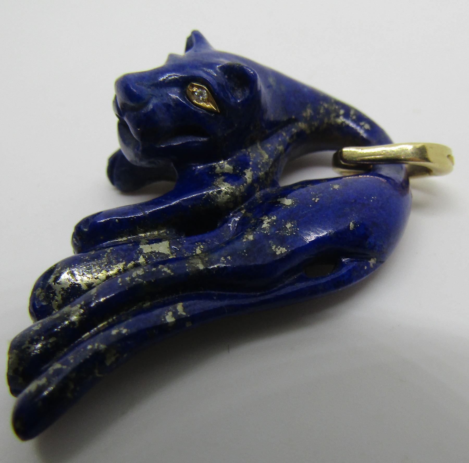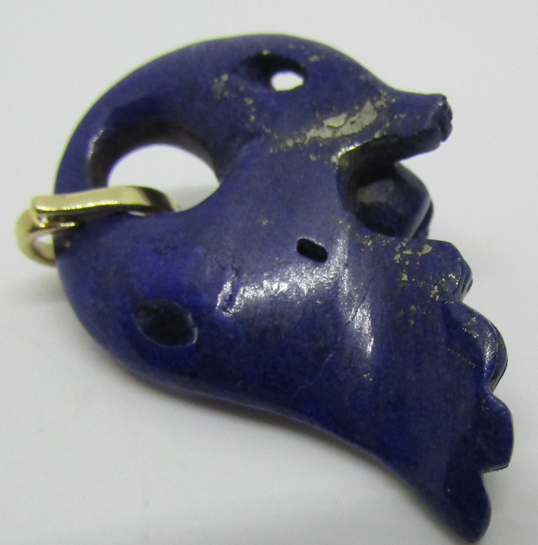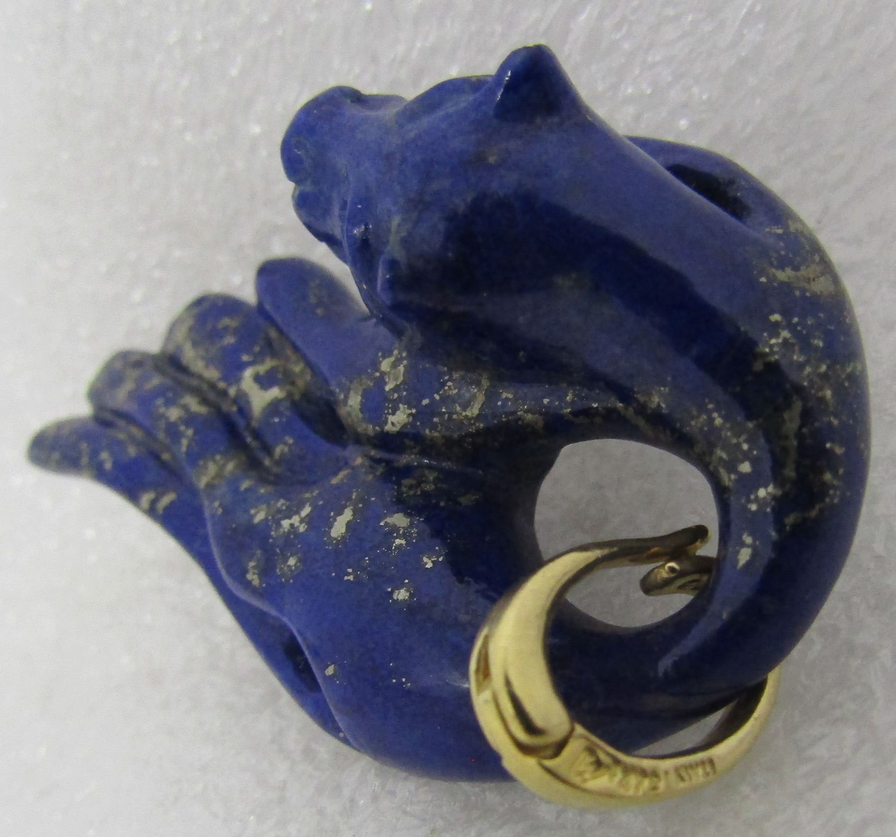 VINTAGE ESTATE 43MM BY 28MM CARVED STONE LAPIS LAZULI WITH 2 DIAMOND EYES. WEIGHS 11.2 GRAMS. MARKED 14K YELLOW GOLD ENHANCER NECKLACE OR PEARL OR BEAD PENDANT BAIL. USA SHIPPING $8.