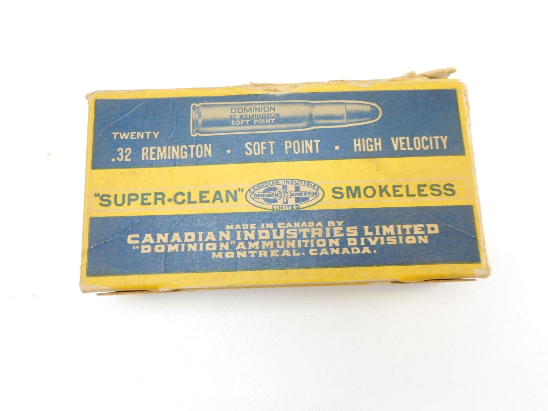 DOMINION 32 REMINGTON AMMO , 12 RNDS 32 REMINGTON SOFT POINT, HIGH VELOCITY AMMO, IN VINTAGE DOMINION BOX